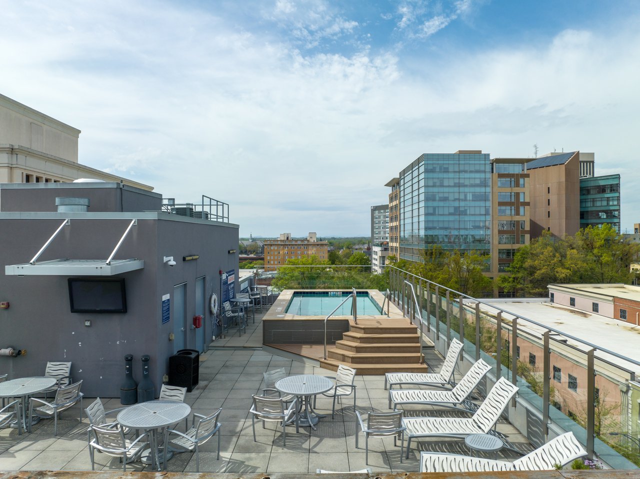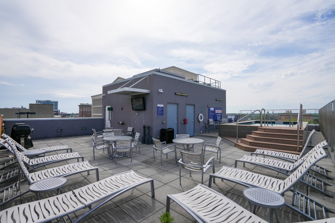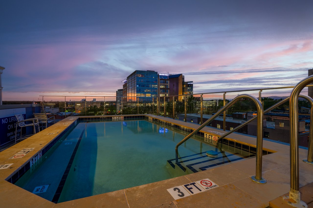 Your life in the One Hundred East community extends well beyond your front door. Take the elevator up to the private community rooftop and lounge area on the eighth floor. This spectacular space features panoramic skyline views, a pool, comfortable seating, grills, and a TV—perfect for entertaining or unwinding after a long day. The community also provides an on-site parking garage, common area maintenance, and a discount on membership to Anytime Fitness on the ground level.