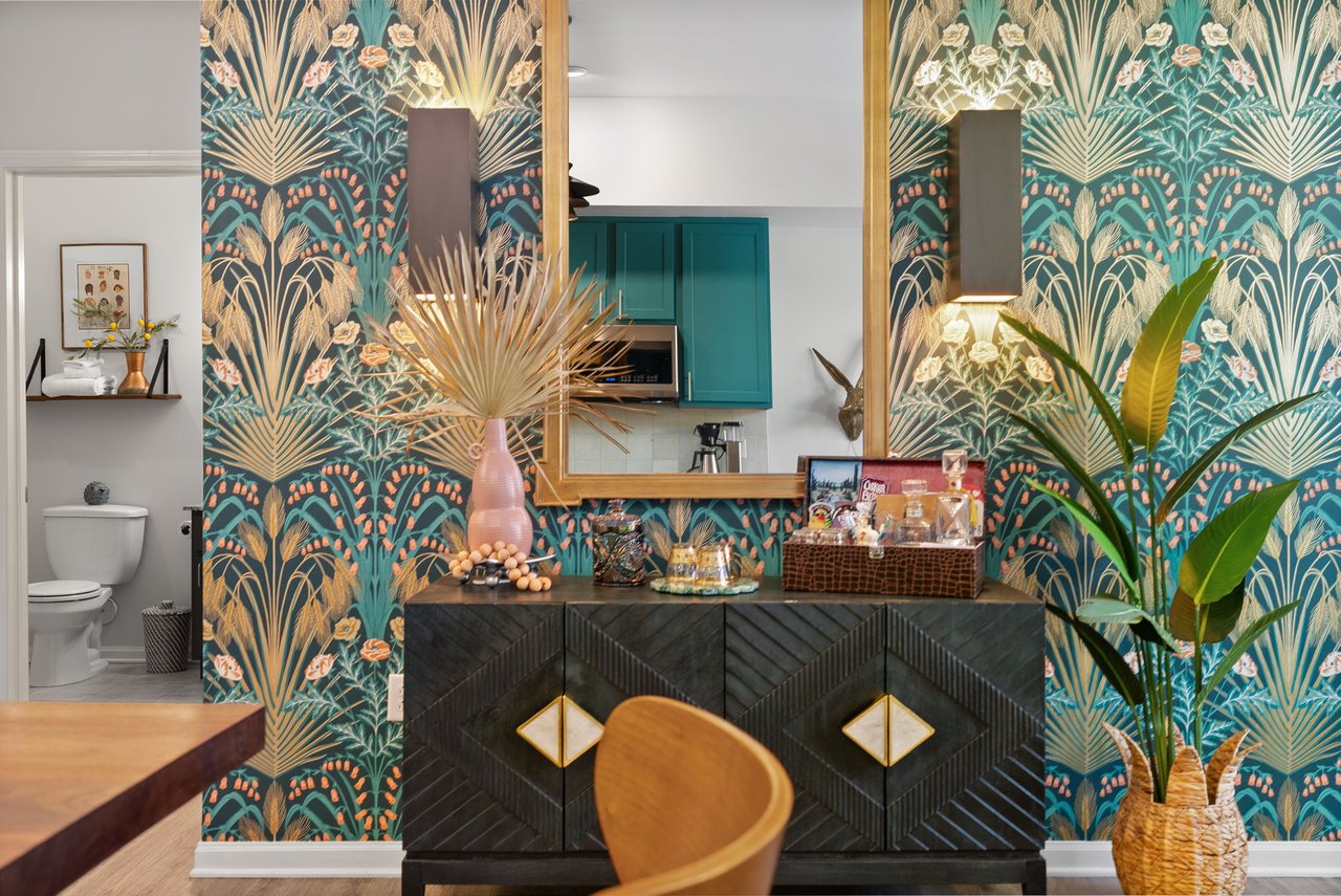 As you step inside this exceptionally designed space, you'll immediately notice the high level of detail and craftsmanship. The interior features custom lighting fixtures and designer wallpaper, complemented by chic paint colors throughout, creating an atmosphere of sophisticated modern living. The kitchen boasts freshly painted cabinets, delivering a stylish contrast to the main living area. Beyond the aesthetics, the unit features a practical upgrade: an upgraded tankless water heater for efficiency and comfort.