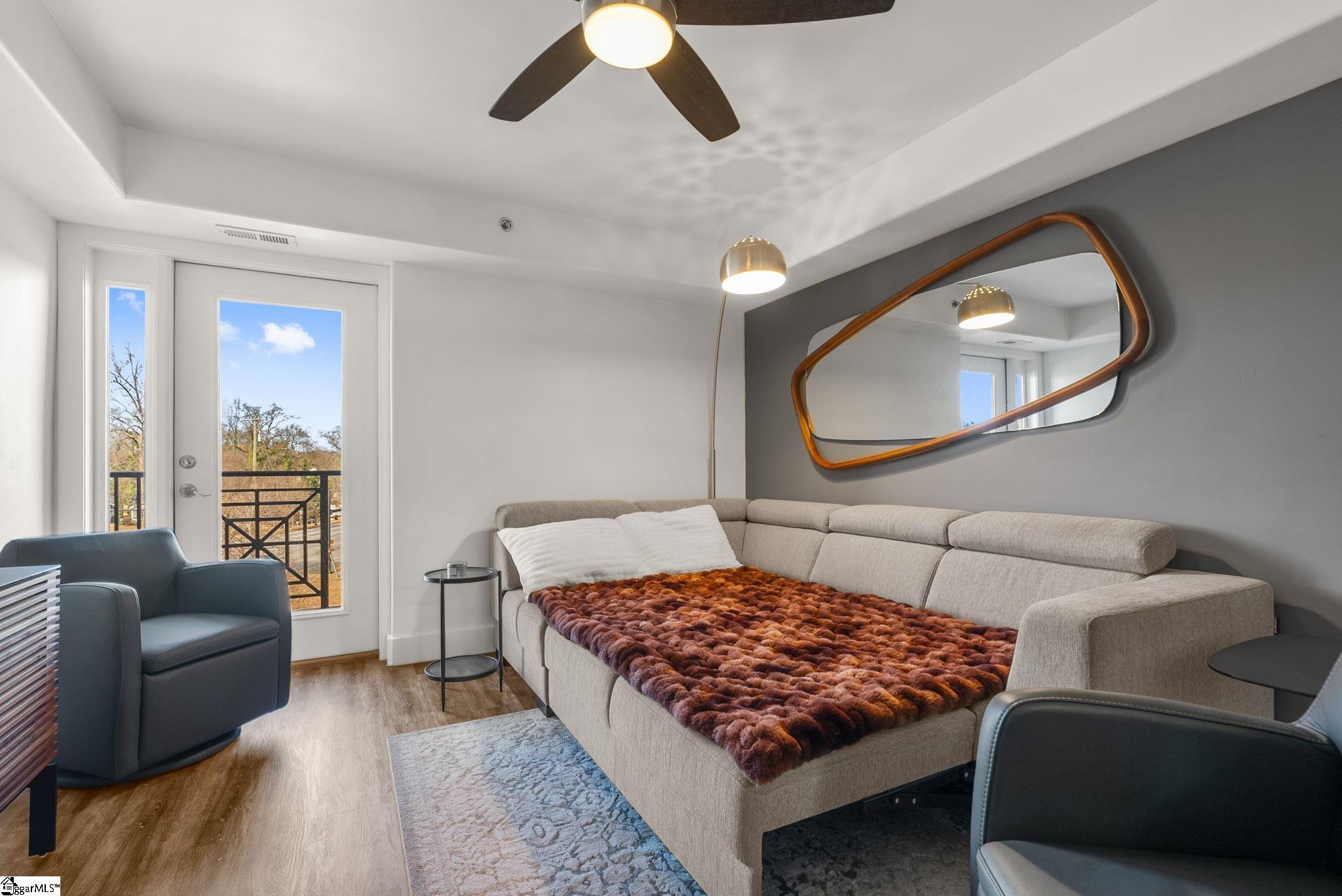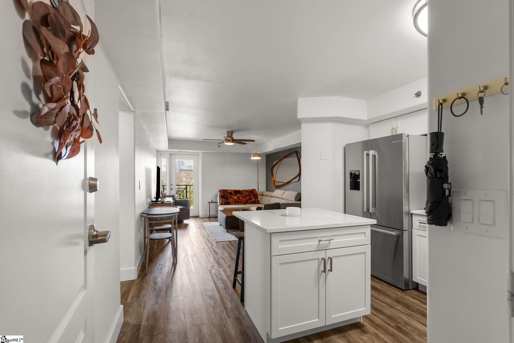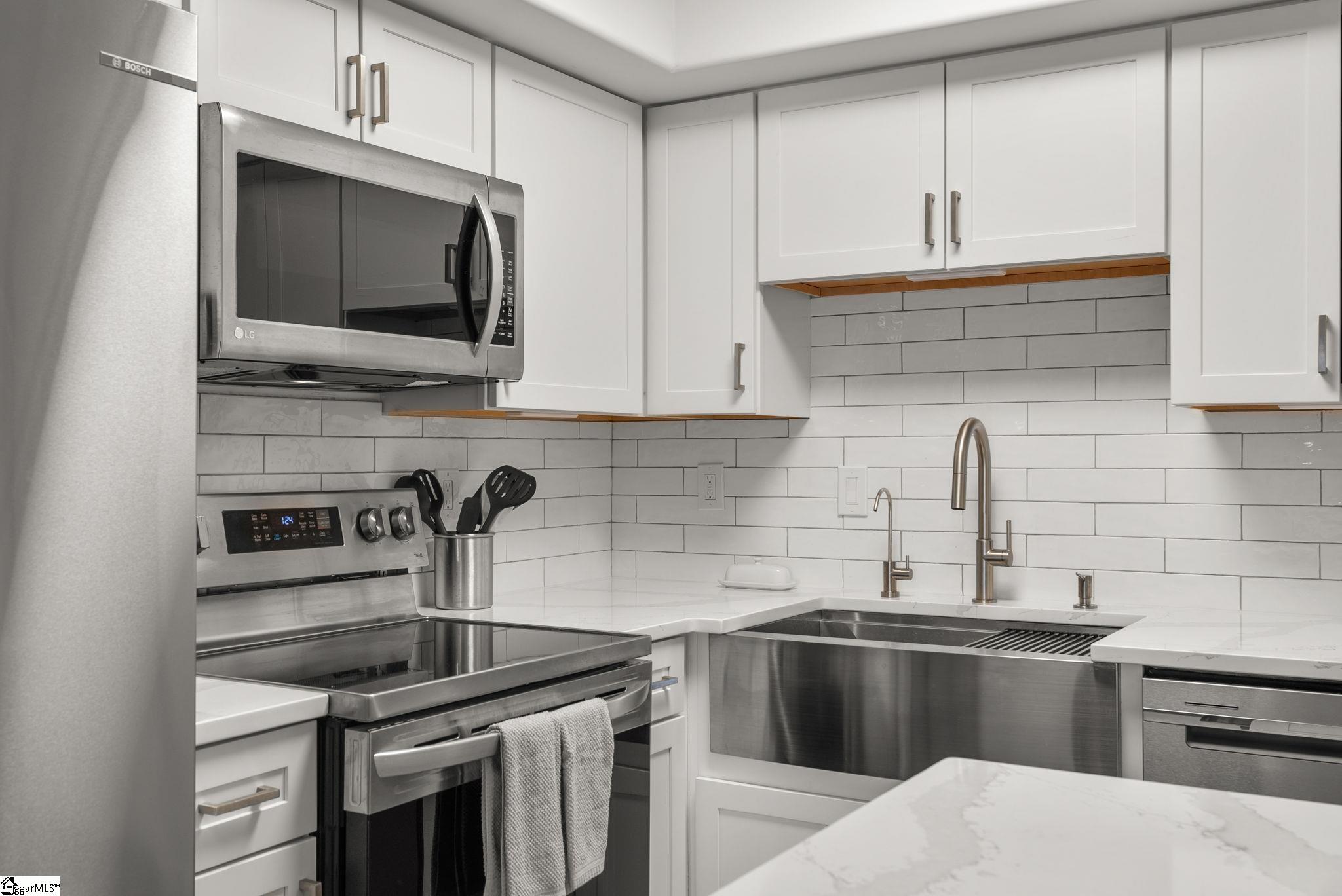 Welcome to The Brio, Unit 504, a thoughtfully updated one-bedroom, one-bathroom residence that captures the essence of sophisticated urban living. Located just steps from the vibrant heart of downtown Greenville, this home offers an unparalleled blend of modern style and residential tranquility. The open-concept floor plan is anchored by a spacious living area that flows naturally to a private balcony, providing a serene vantage point for stunning city views. Whether you are entertaining guests or enjoying a quiet evening, the seamless transition between indoor and outdoor spaces creates an inviting atmosphere of comfort and ease. The interior is defined by refined finishes and practical elegance. The chef-inspired kitchen is equipped with premium white quartz countertops, stainless steel appliances, and a classic subway tile backsplash, all centered around a functional island with seating for two. The primary suite serves as a spacious retreat, featuring a generous walk-in closet and an updated bathroom complete with double vanities and contemporary fixtures. For added convenience, the unit also includes an outdoor storage closet, ensuring your living space remains organized and uncluttered. Life at The Brio extends beyond the walls of the apartment, offering residents a resort-style experience and total peace of mind. The community's elegant Italian-inspired architecture and newly renovated lobby--complete with stacked-stone accents and a tranquil water fountain--set a distinguished tone. Residents enjoy exclusive access to a saltwater pool, a modern fitness center, a grilling pavilion, and an on-site dog park. Security is a top priority, with gated parking, keycard entry, and telephone-controlled guest access ensuring maximum privacy and safety. The location is truly second to none, placing you within a mile of Greenville's most iconic landmarks, including Falls Park, Unity Park, and the scenic Swamp Rabbit Trail. You are also perfectly positioned to explore the boutiques and award-winning dining of Augusta Road. Unit 504 represents a rare opportunity to embrace a high-end downtown lifestyle characterized by convenience, community, and exceptional value.