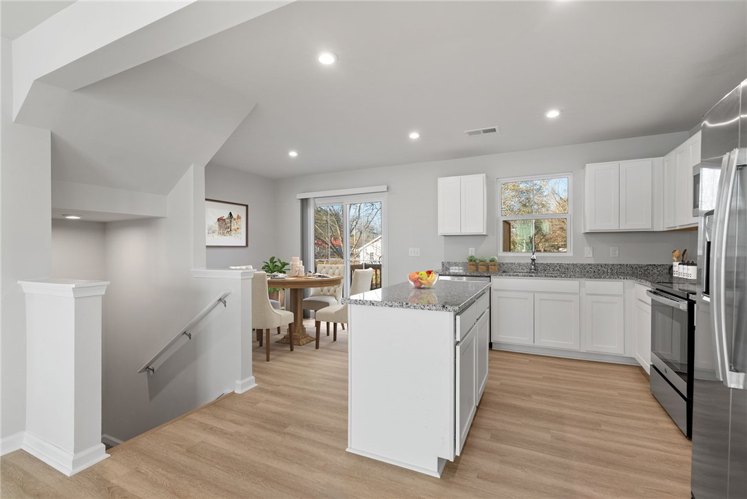 Located at 109 Brooklane Ct., this stunning three-story townhouse in the desirable Edgewood Townes subdivision provides the perfect blend of modern style and low-maintenance living. The heart of the home anchors the second floor, featuring a bright, open-concept layout that encourages effortless entertaining. The kitchen dazzles with granite countertops, sleek stainless steel appliances, and ample cabinetry. Sunlight floods the area. A large living room, dining area, and half bath complete this floor. The main level grants seamless access to a private balcony, perfect for relaxing outdoors.