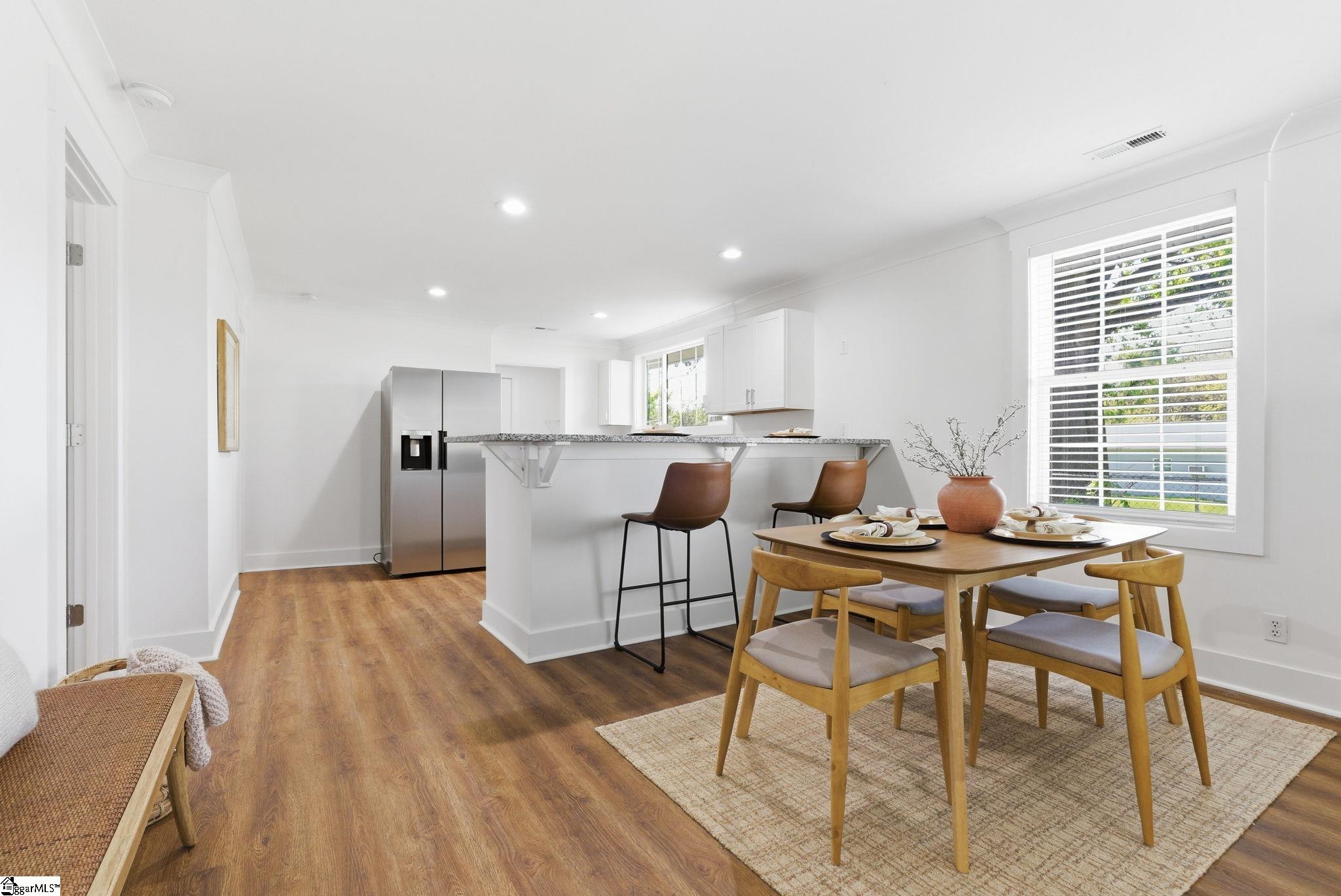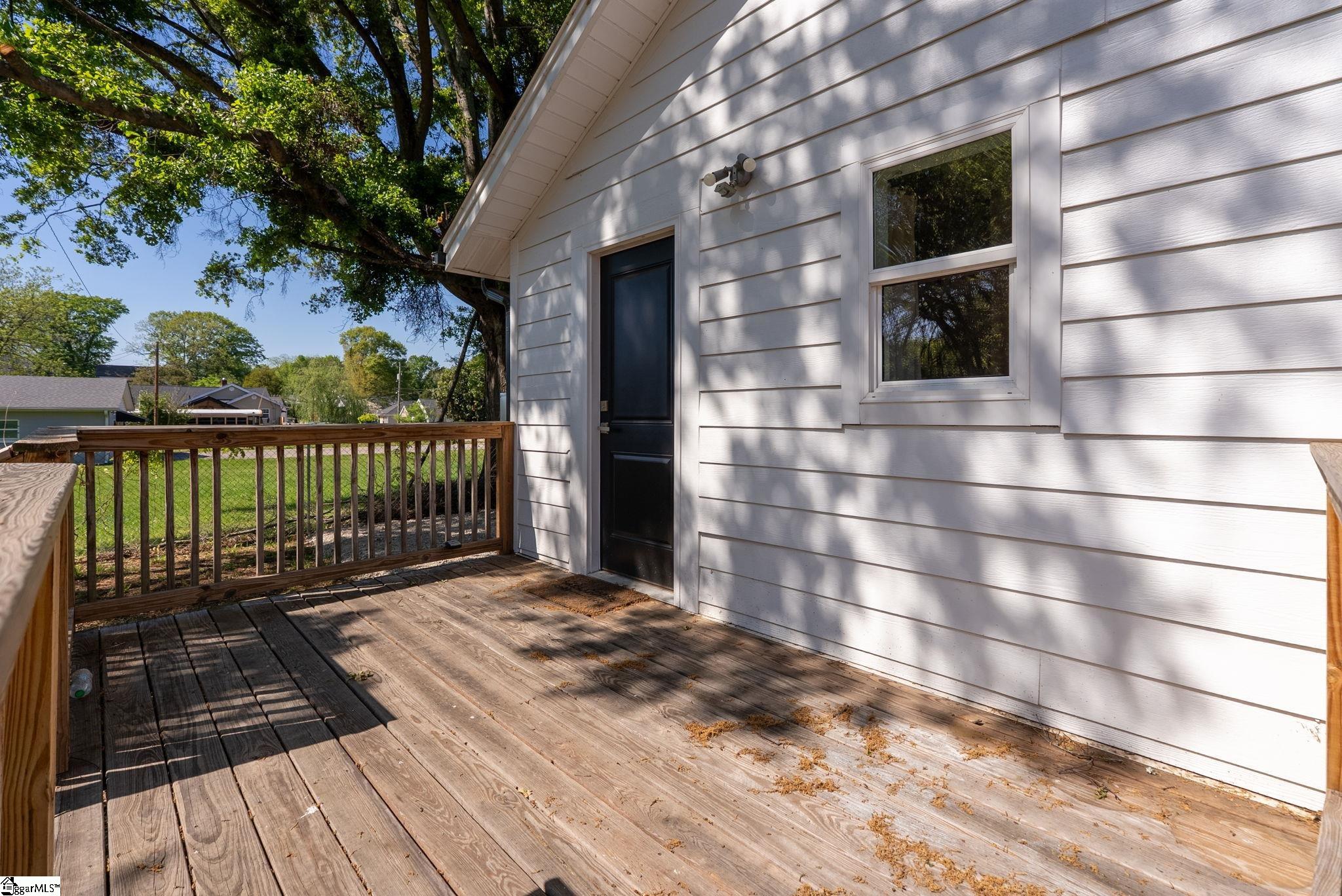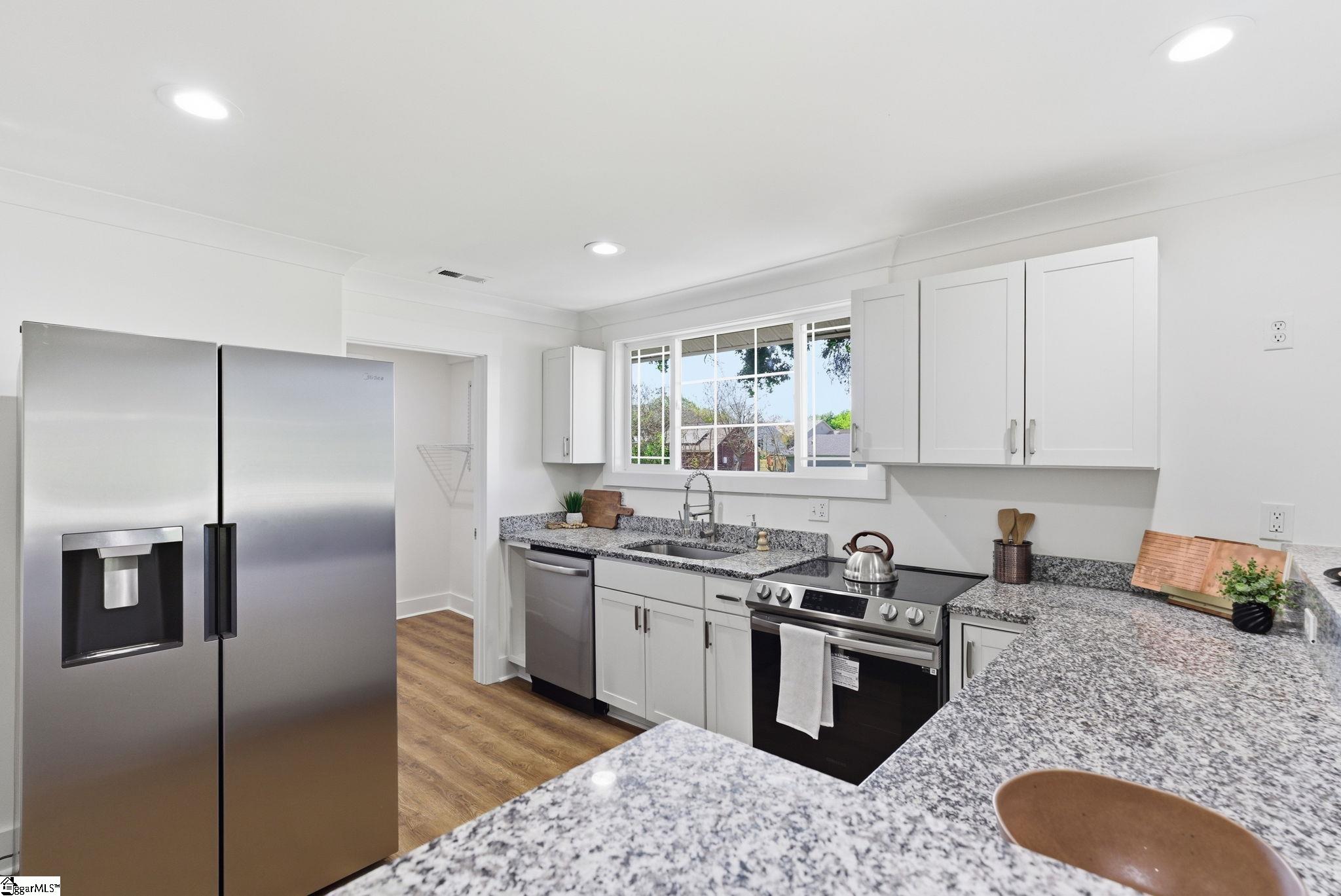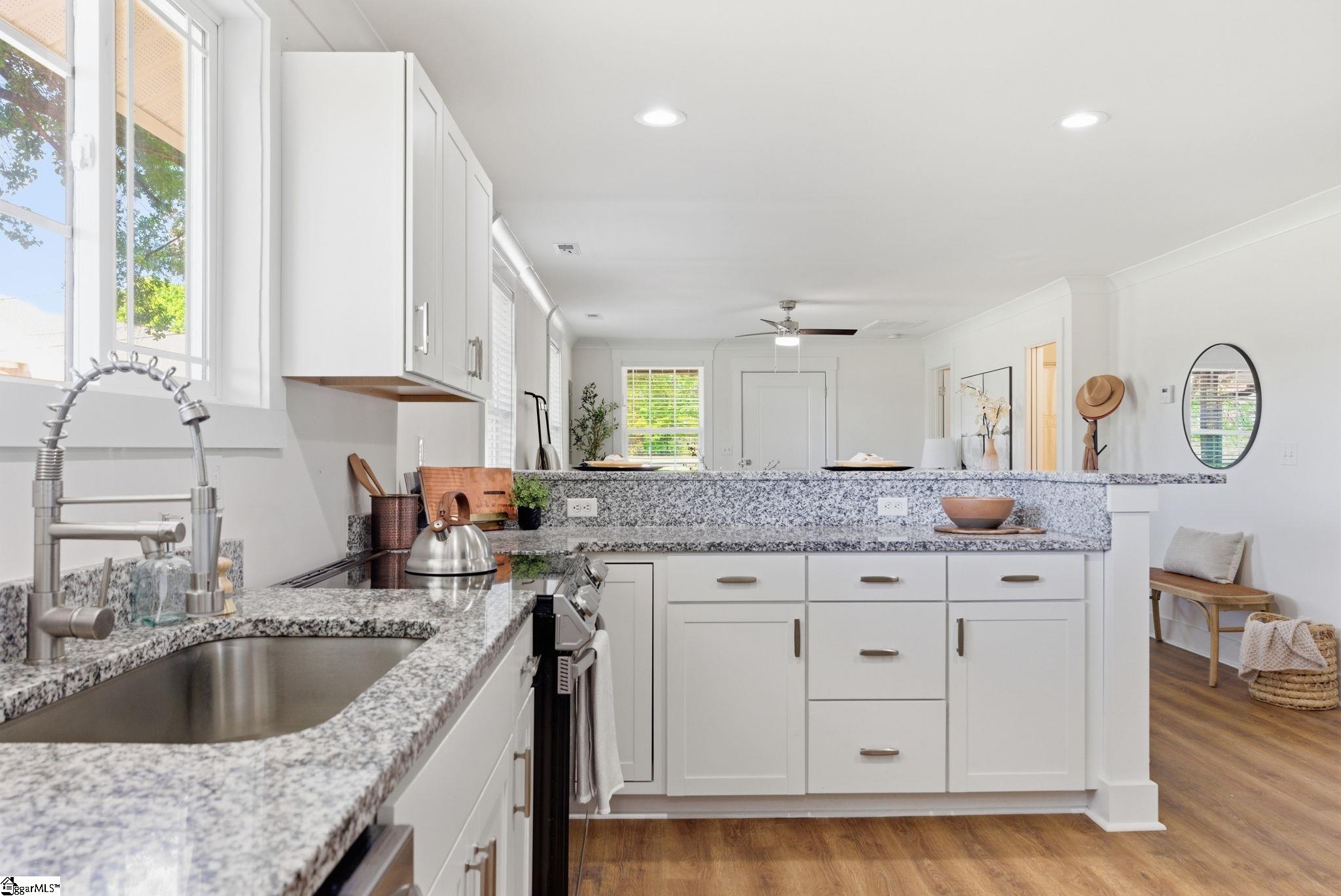 Nestled in the vibrant Judson Mill area, this beautifully reimagined single-family home offers the perfect blend of modern luxury and prime location, situated just a couple of miles from the heart of downtown Greenville. Having recently undergone a full interior renovation, the residence features stylish LVP flooring throughout and an inviting, open-concept floor plan. The living room is bathed in abundant natural light, flowing seamlessly into a kitchen that boasts granite countertops, stainless steel appliances, timeless shaker-style cabinetry, and a convenient peninsula with bar seating. The home's thoughtful layout includes a spacious primary suite with a full tub/shower combo, another well-appointed bedroom, and a versatile third room that functions perfectly as a flex space, home office, or third bedroom. Outside, the property is designed for relaxation and entertainment, featuring a huge front porch for neighborhood greeting and a rear deck overlooking a large, partially fenced yard. With its close proximity to the trendy West Greenville, Unity Park, and the Swamp Rabbit Trail, this home places you at the doorstep of the city's best outdoor and culinary amenities.