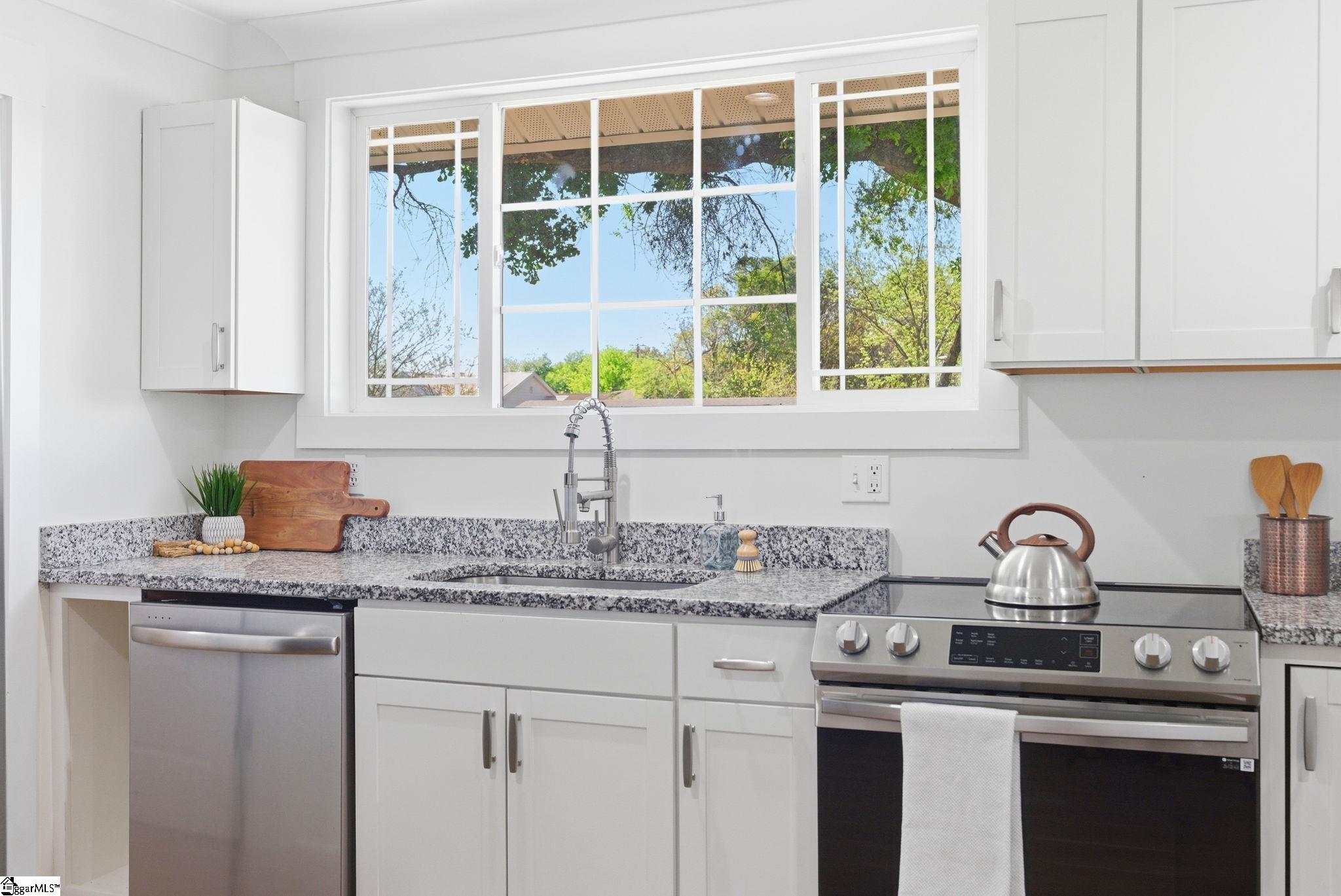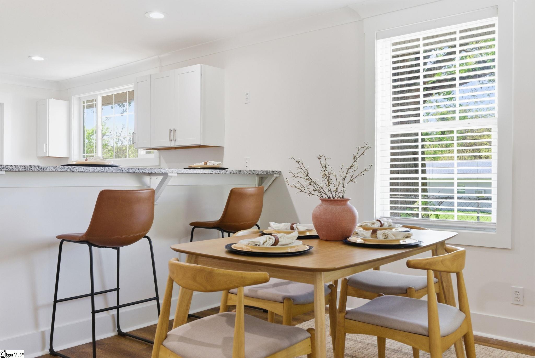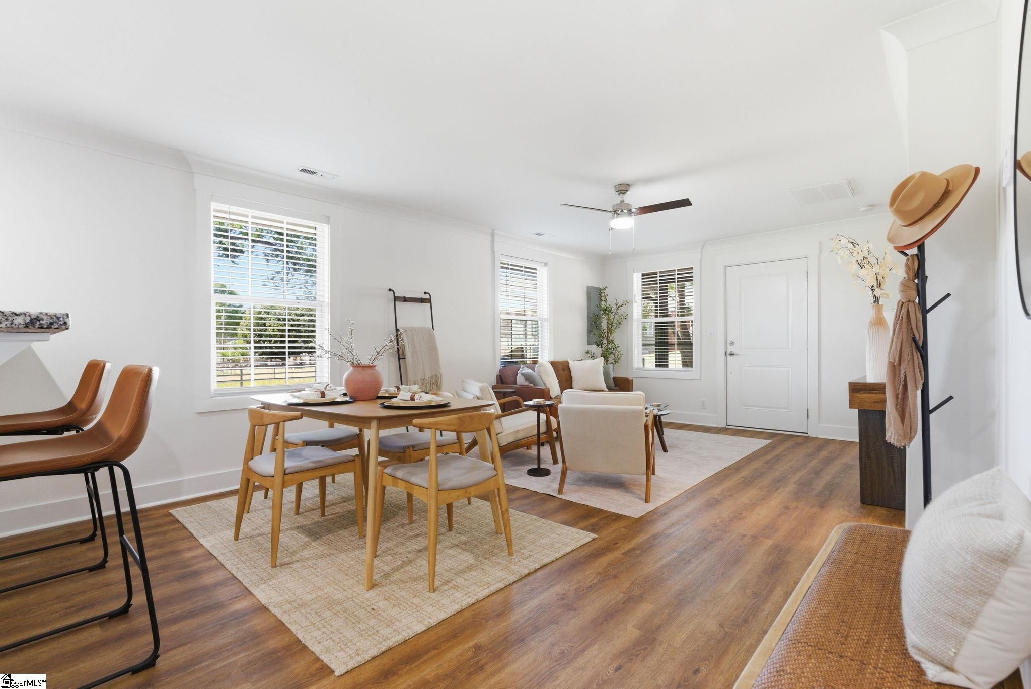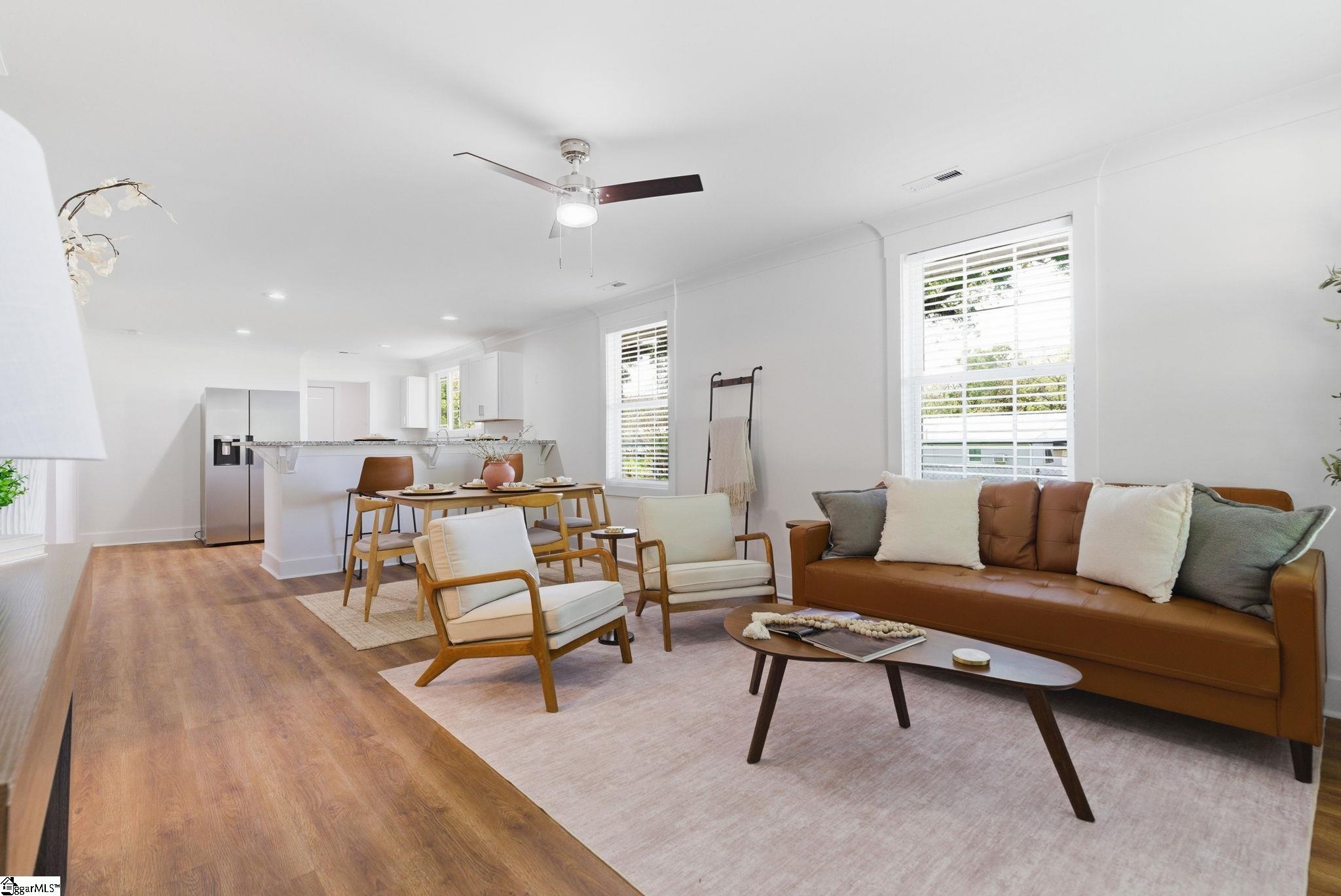 Nestled in the vibrant Judson Mill area, this beautifully reimagined single-family home offers the perfect blend of modern luxury and prime location, situated just a couple of miles from the heart of downtown Greenville. Having recently undergone a full interior renovation, the residence features stylish LVP flooring throughout and an inviting, open-concept floor plan. The living room is bathed in abundant natural light, flowing seamlessly into a kitchen that boasts granite countertops, stainless steel appliances, timeless shaker-style cabinetry, and a convenient peninsula with bar seating. The home's thoughtful layout includes a spacious primary suite with a full tub/shower combo, another well-appointed bedroom, and a versatile third room that functions perfectly as a flex space, home office, or third bedroom. Outside, the property is designed for relaxation and entertainment, featuring a huge front porch for neighborhood greeting and a rear deck overlooking a large, partially fenced yard. With its close proximity to the trendy West Greenville, Unity Park, and the Swamp Rabbit Trail, this home places you at the doorstep of the city's best outdoor and culinary amenities.