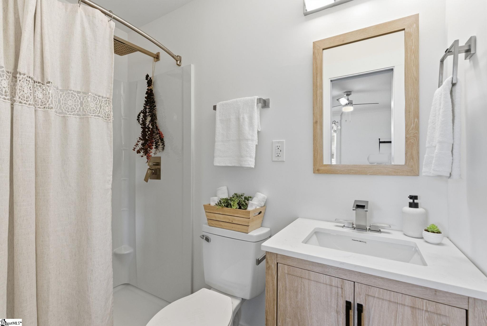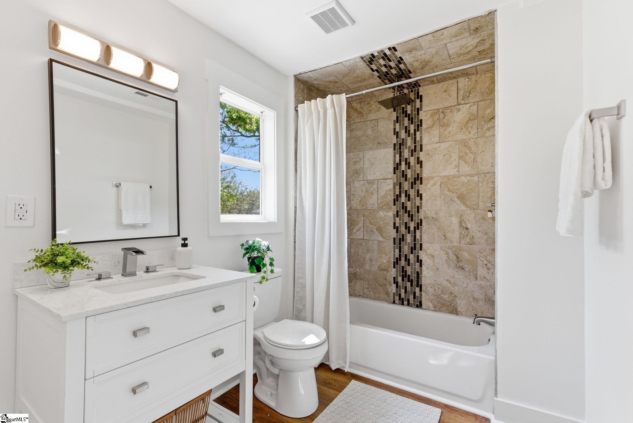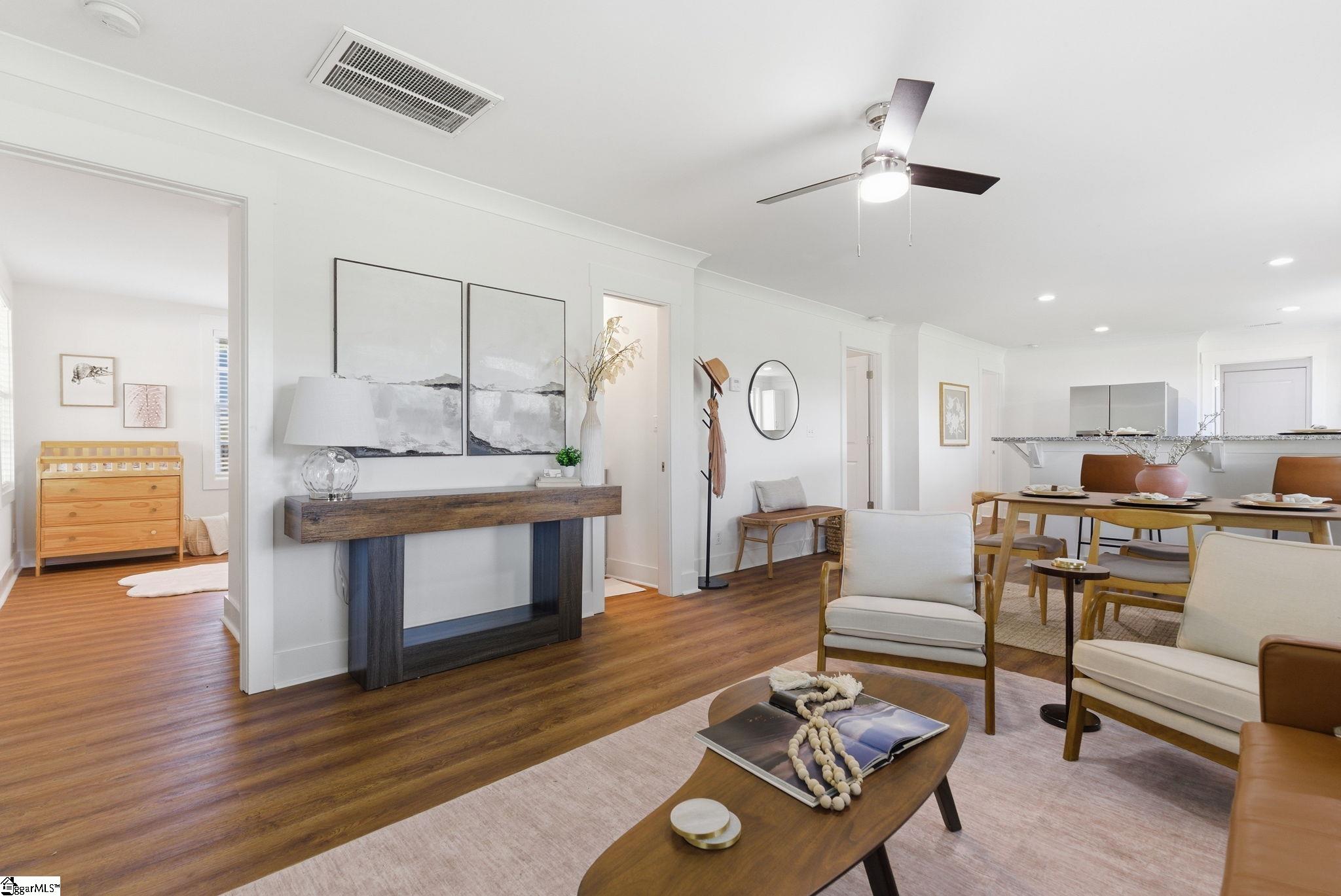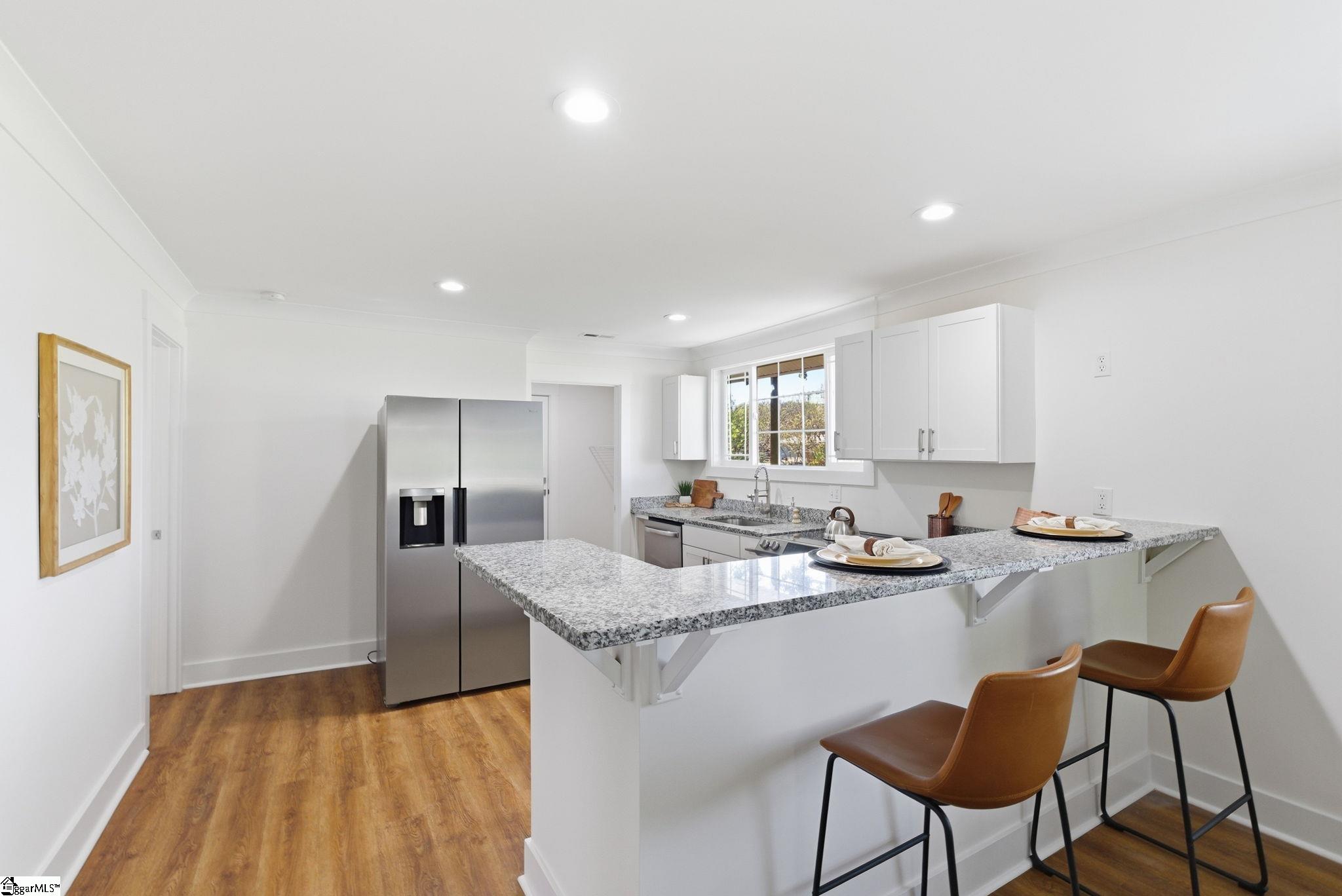Nestled in the vibrant Judson Mill area, this beautifully reimagined single-family home offers the perfect blend of modern luxury and prime location, situated just a couple of miles from the heart of downtown Greenville. Having recently undergone a full interior renovation, the residence features stylish LVP flooring throughout and an inviting, open-concept floor plan. The living room is bathed in abundant natural light, flowing seamlessly into a kitchen that boasts granite countertops, stainless steel appliances, timeless shaker-style cabinetry, and a convenient peninsula with bar seating. The home's thoughtful layout includes a spacious primary suite with a full tub/shower combo, another well-appointed bedroom, and a versatile third room that functions perfectly as a flex space, home office, or third bedroom. Outside, the property is designed for relaxation and entertainment, featuring a huge front porch for neighborhood greeting and a rear deck overlooking a large, partially fenced yard. With its close proximity to the trendy West Greenville, Unity Park, and the Swamp Rabbit Trail, this home places you at the doorstep of the city's best outdoor and culinary amenities.
