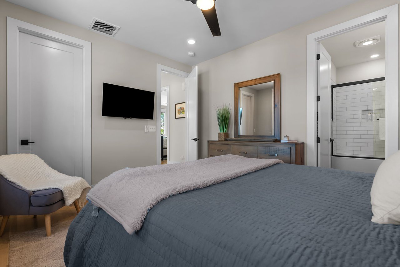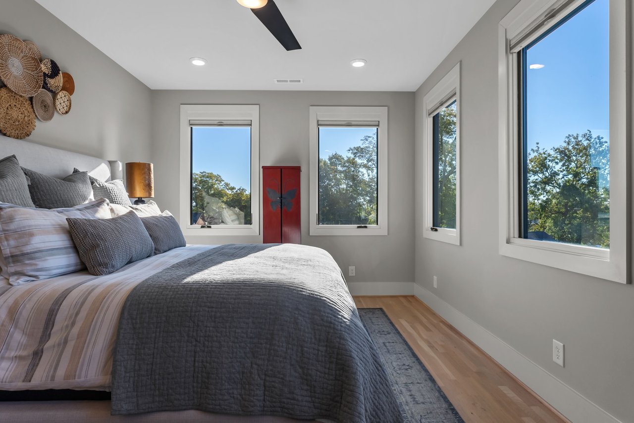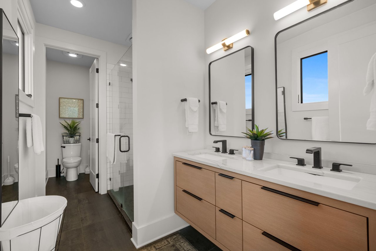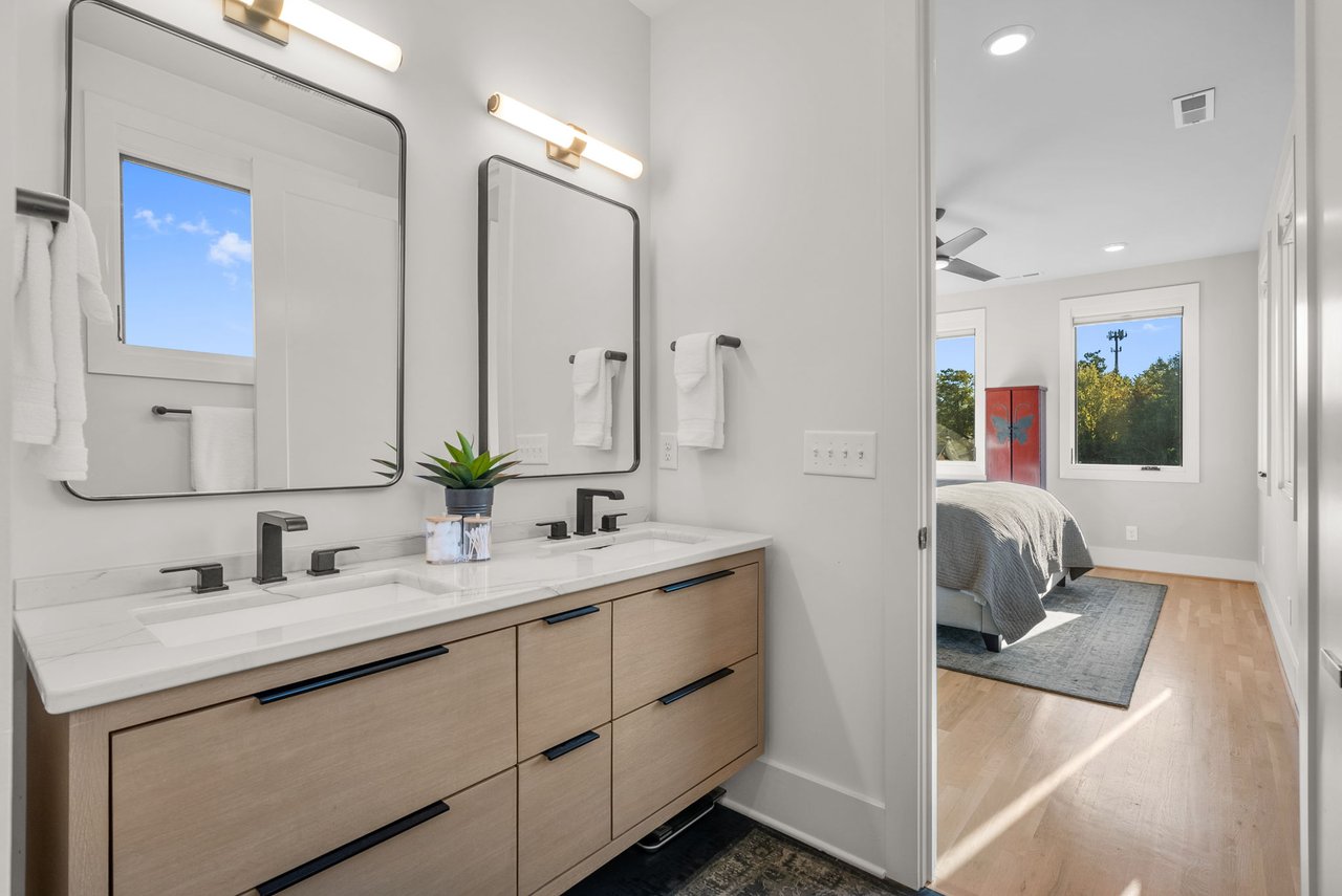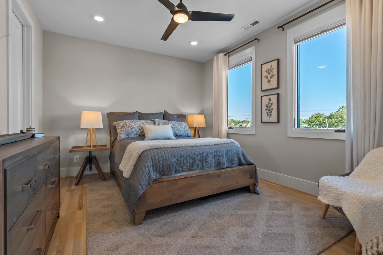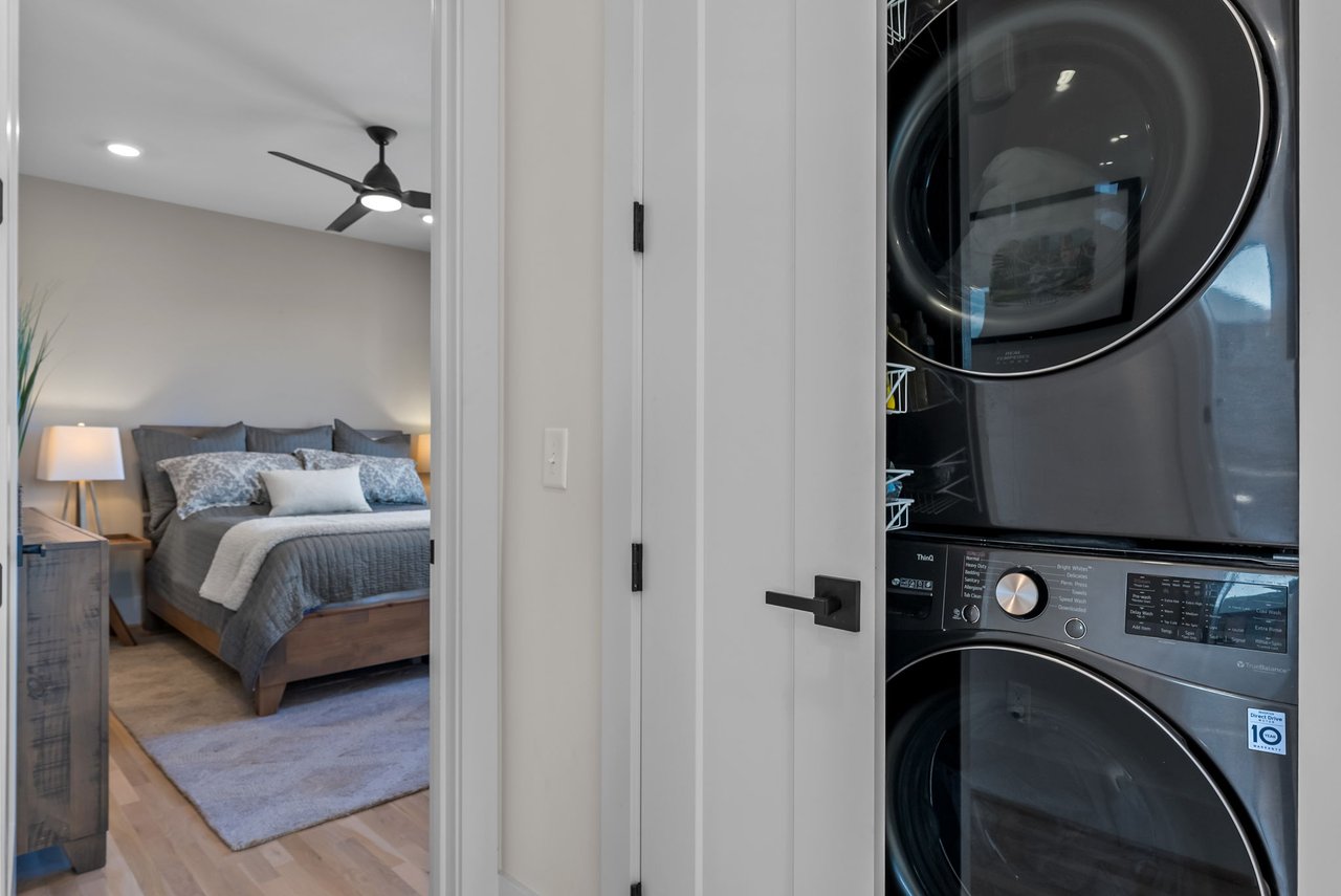 Brilliantly designed, the third floor grants residents and guests a respite and a chance to recharge before returning to the city's liveliness. The primary bedroom, situated on the corner of the unit, presents a scenic view of the neighborhood and is complete with a full bathroom and walk-in closet. The suite's generous bathroom has a dual, floating vanity, quartz countertops, large-format tile flooring, and a tile walk-in shower. The stackable laundry closet sits between the primary and guest bedrooms. Enjoy privacy in the guest suite, which has ample closet space and a full bathroom.