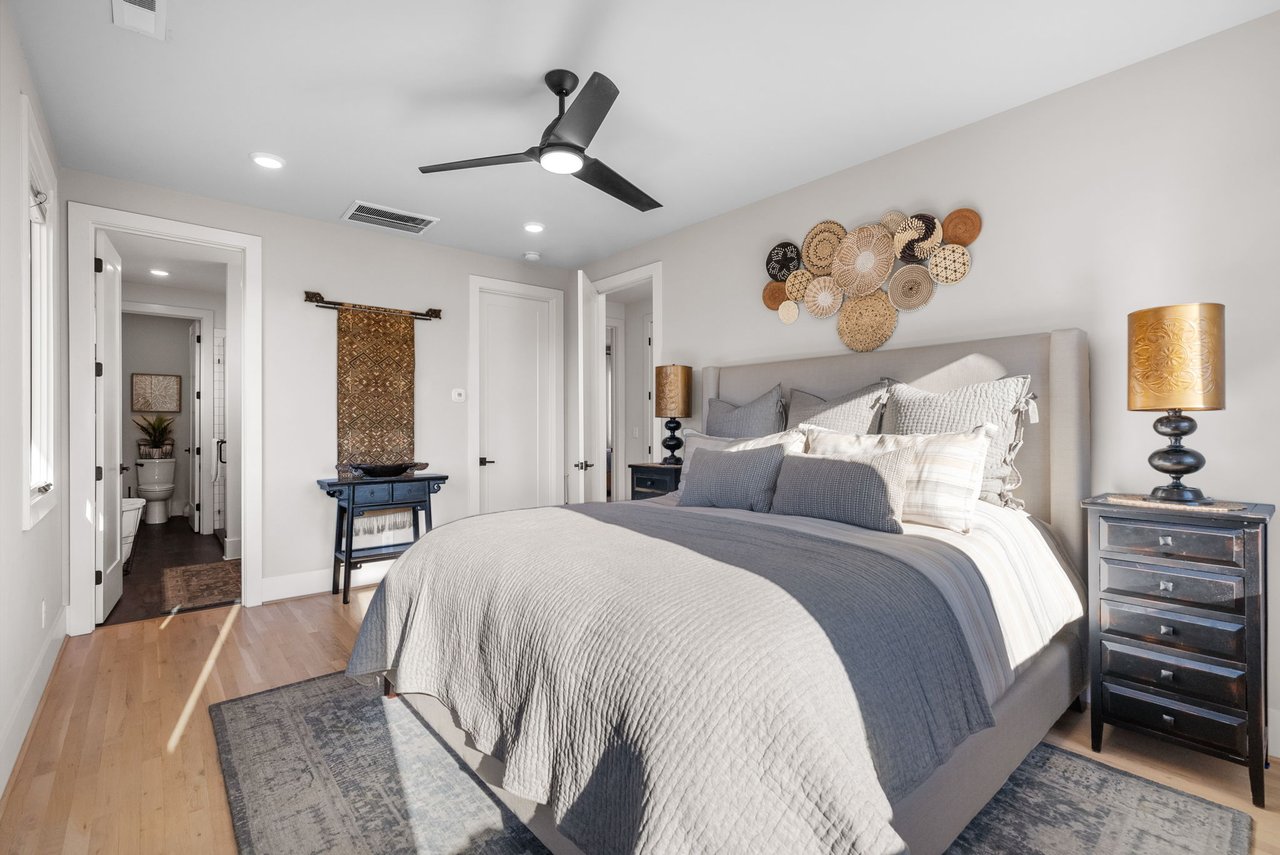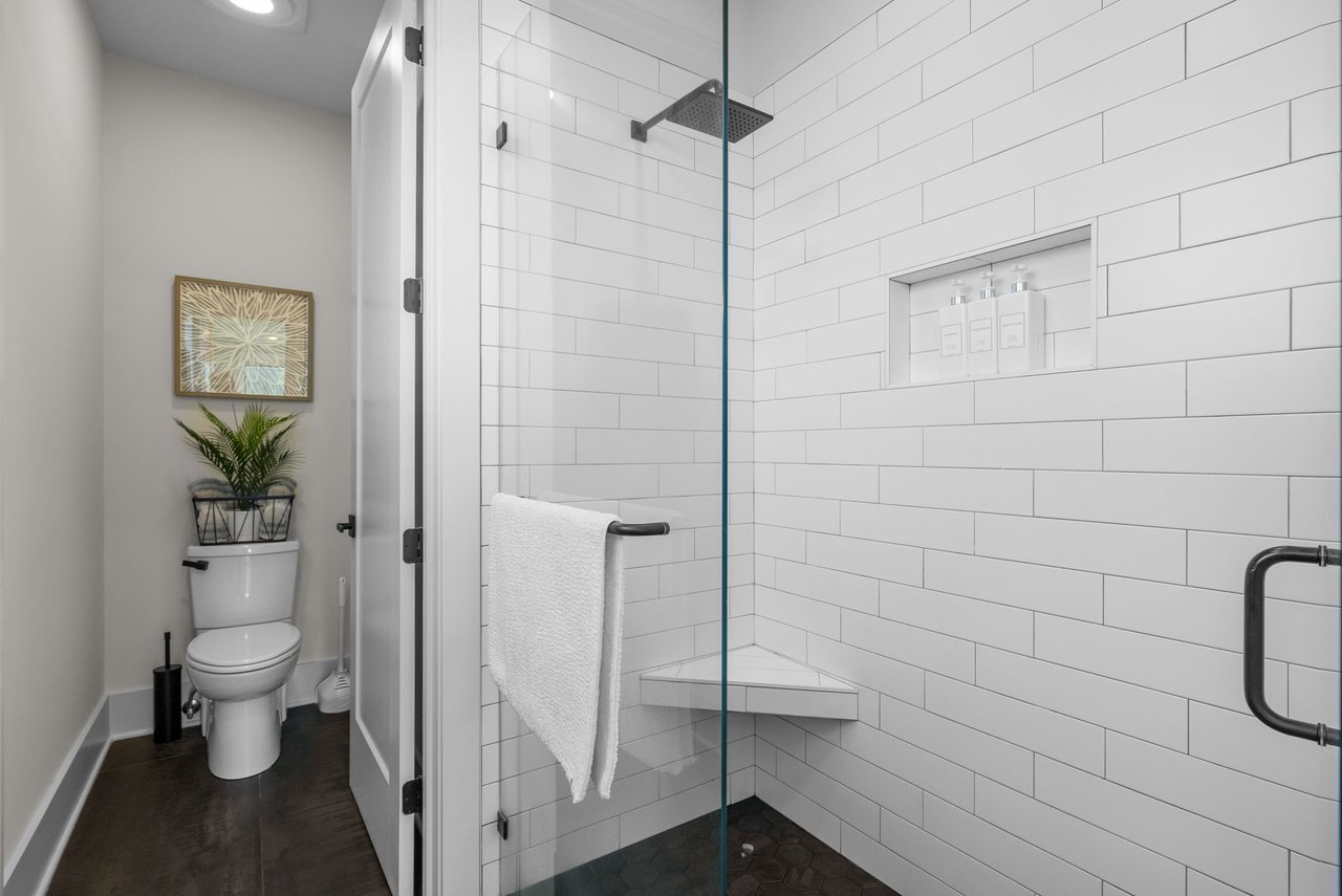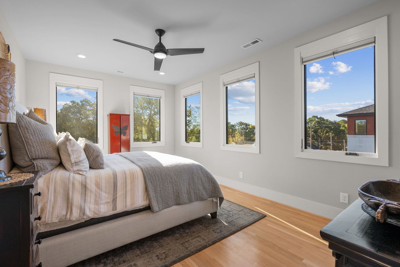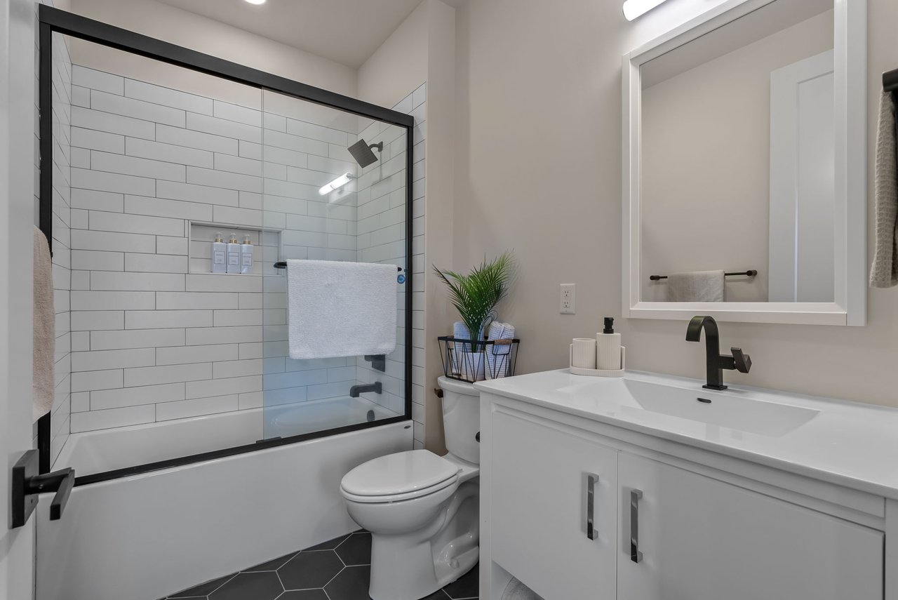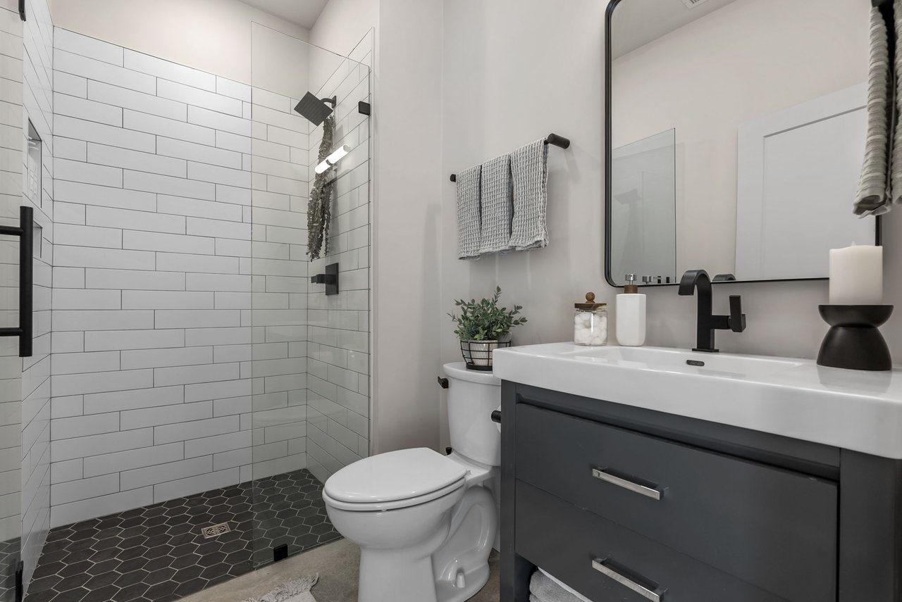 Brilliantly designed, the third floor grants residents and guests a respite and a chance to recharge before returning to the city's liveliness. The primary bedroom, situated on the corner of the unit, presents a scenic view of the neighborhood and is complete with a full bathroom and walk-in closet. The suite's generous bathroom has a dual, floating vanity, quartz countertops, large-format tile flooring, and a tile walk-in shower. The stackable laundry closet sits between the primary and guest bedrooms. Enjoy privacy in the guest suite, which has ample closet space and a full bathroom.