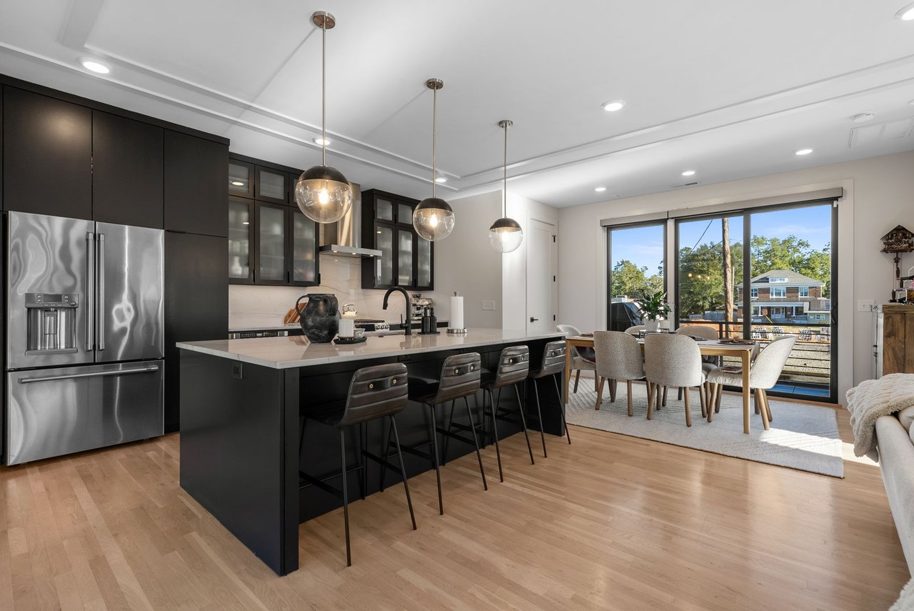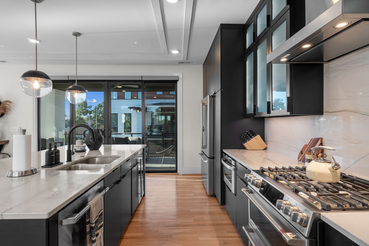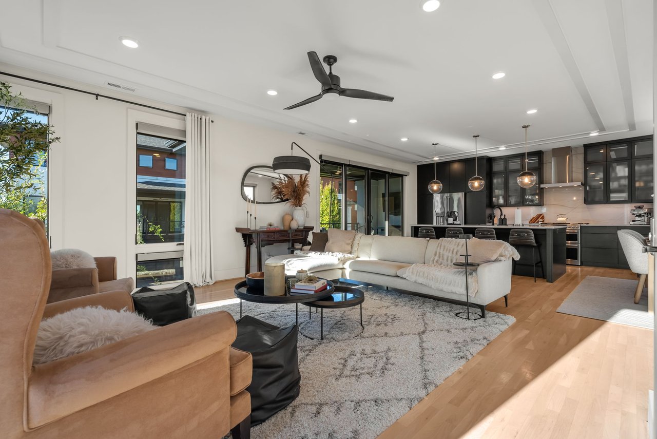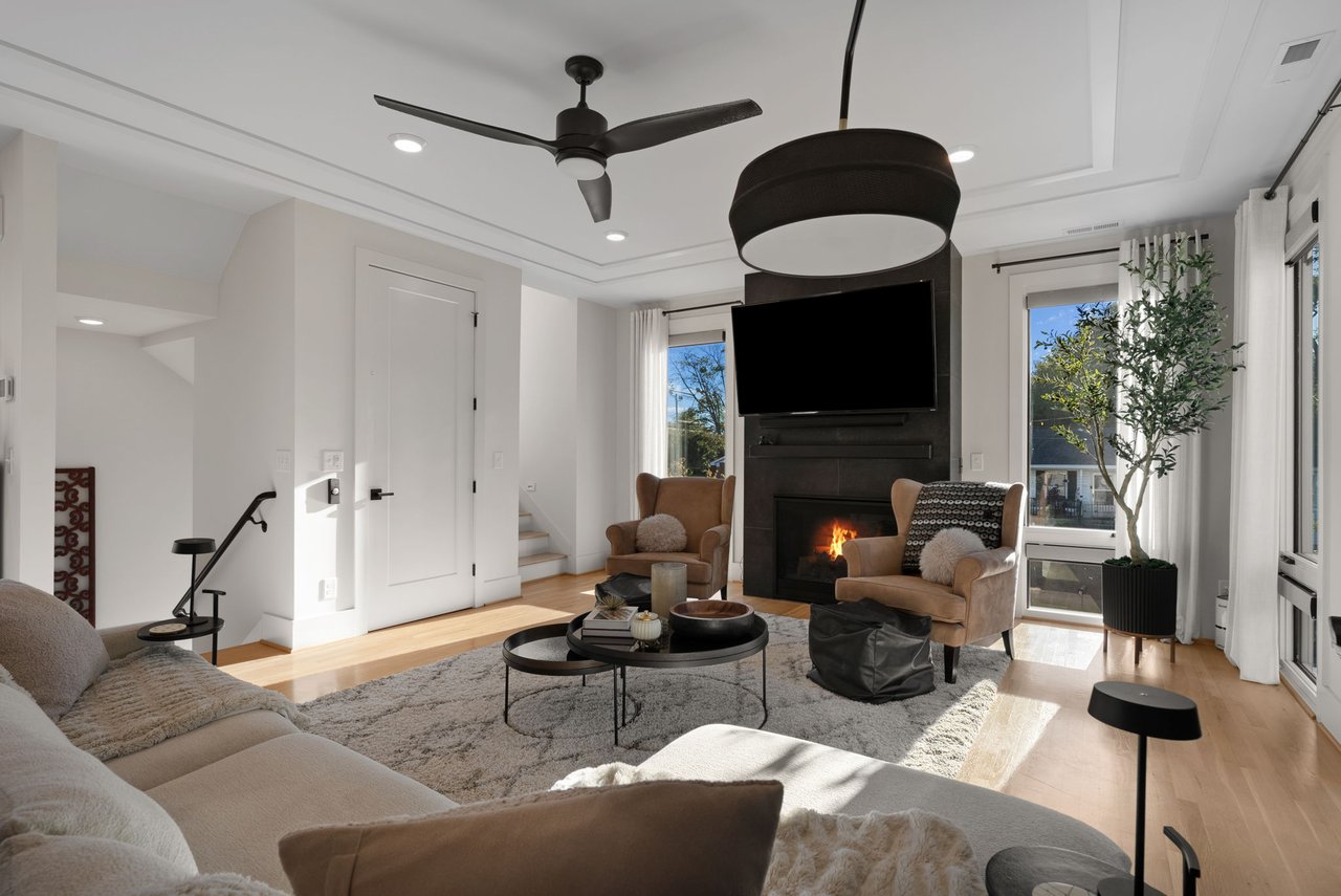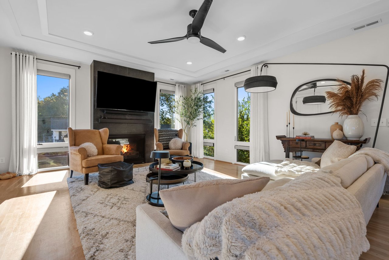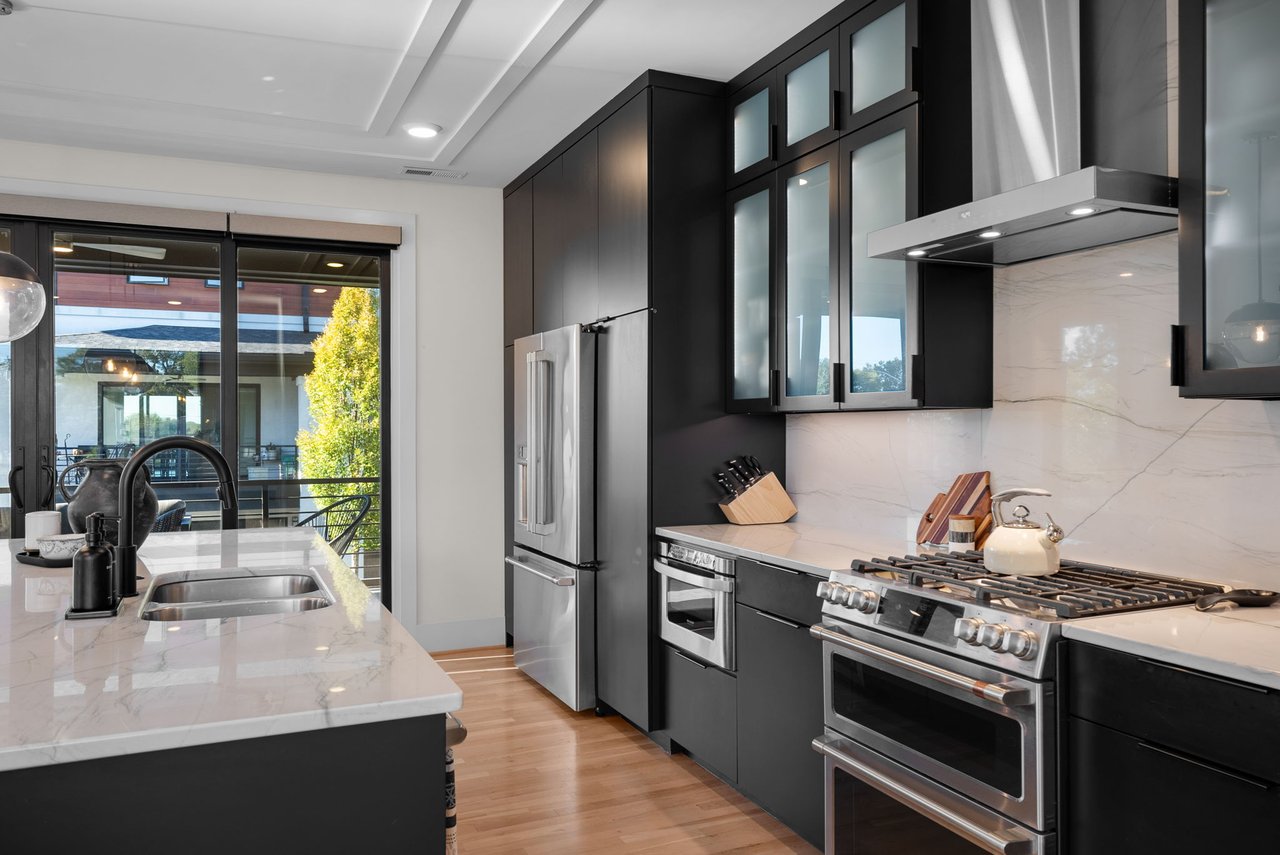 Through floor-to-ceiling casement windows and sliding doors, natural light welcomes you on each level. The ground floor showcases stained concrete floors, a flex room for a study or guest bedroom, a full bathroom with a walk-in tile shower, and access to the epoxy-coated garage and the fenced-in, turfed backyard. Head to level two via the hardwood-enveloped elevator or the brightly lit stairwell. Take in the second-story finishes throughout the living area, kitchen, half bath, and dining room—featuring white oak hardwoods, a gas fireplace with a large-format slate tile surround, sleek coffered ceiling moldings, custom window treatments, a chic ceiling fan and pendants, and recessed LED lighting. The kitchen's quartz covers the massive island, countertops, and range wall to the ceiling. The stained, slab-style cabinetry extends floor to ceiling, featuring opaque glass and custom lighting that accentuates the ceiling height. Conveniently access the two spacious covered terraces with slate-style flooring through the kitchen or dining area—ideal for indoor-outdoor entertaining or unwinding.