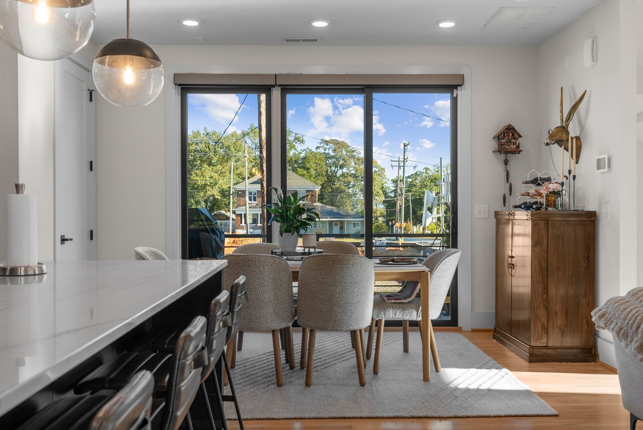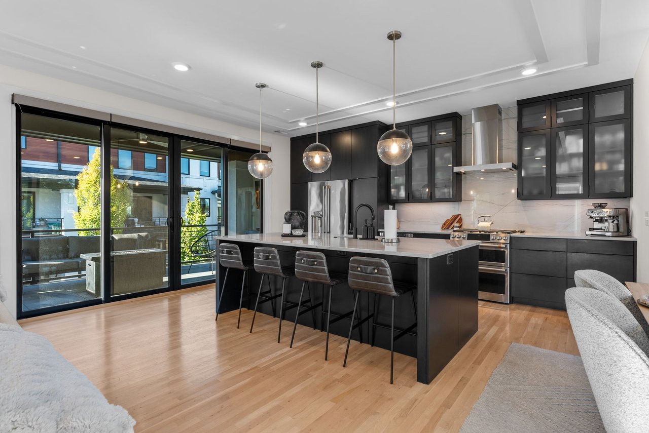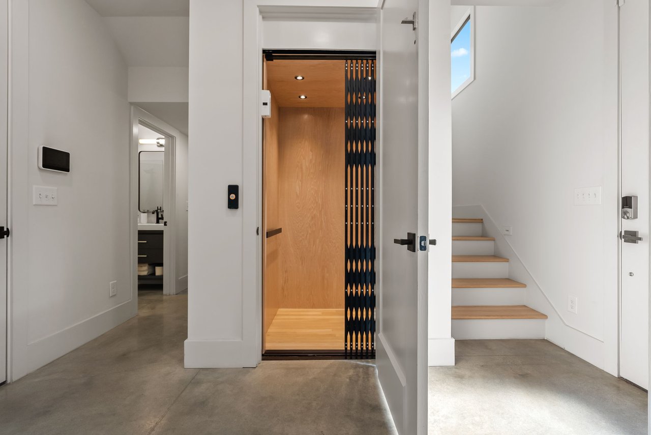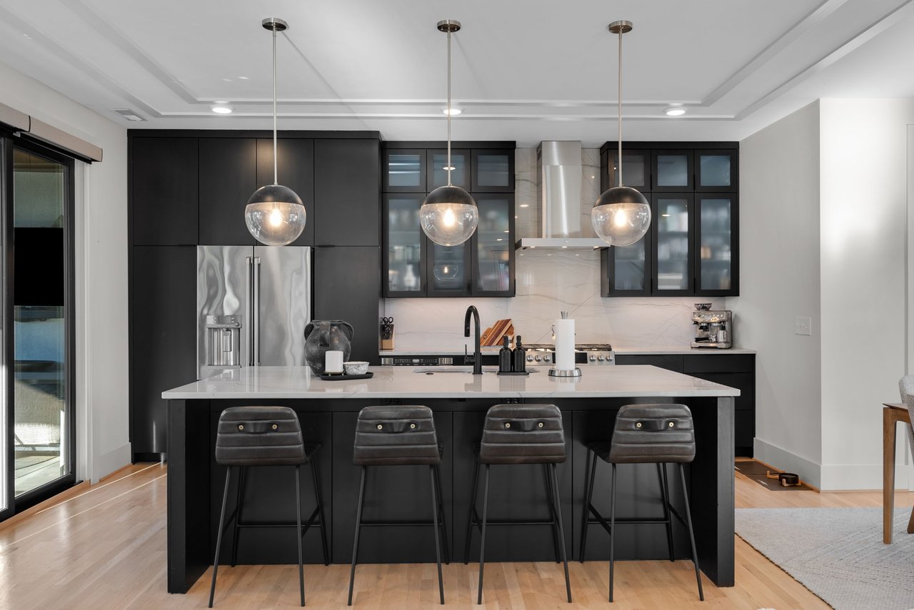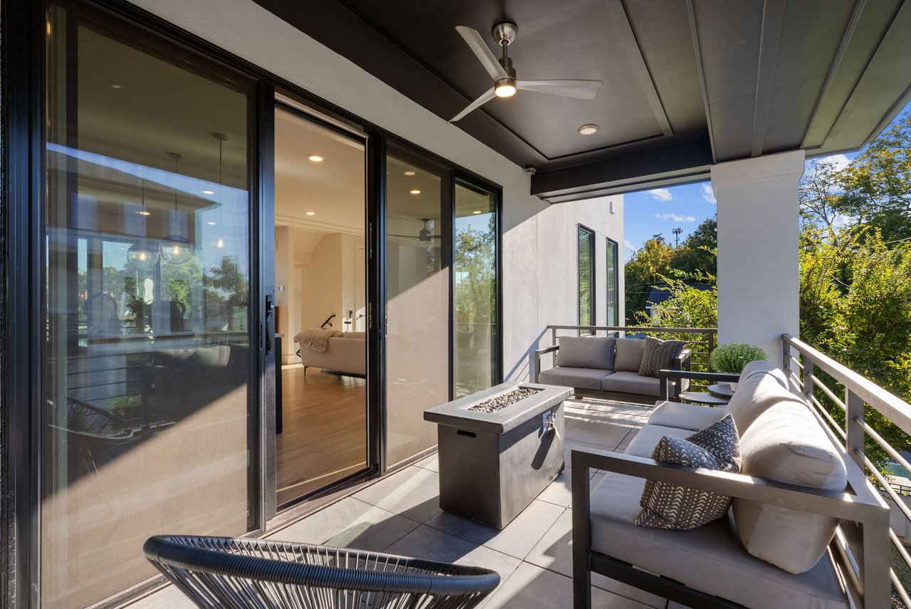 Through floor-to-ceiling casement windows and sliding doors, natural light welcomes you on each level. The ground floor showcases stained concrete floors, a flex room for a study or guest bedroom, a full bathroom with a walk-in tile shower, and access to the epoxy-coated garage and the fenced-in, turfed backyard. Head to level two via the hardwood-enveloped elevator or the brightly lit stairwell. Take in the second-story finishes throughout the living area, kitchen, half bath, and dining room—featuring white oak hardwoods, a gas fireplace with a large-format slate tile surround, sleek coffered ceiling moldings, custom window treatments, a chic ceiling fan and pendants, and recessed LED lighting. The kitchen's quartz covers the massive island, countertops, and range wall to the ceiling. The stained, slab-style cabinetry extends floor to ceiling, featuring opaque glass and custom lighting that accentuates the ceiling height. Conveniently access the two spacious covered terraces with slate-style flooring through the kitchen or dining area—ideal for indoor-outdoor entertaining or unwinding.