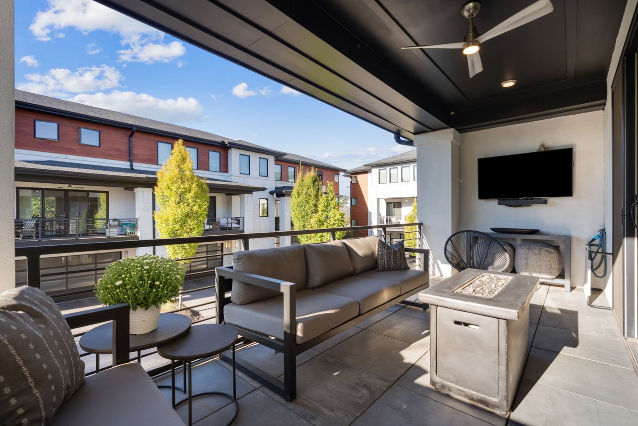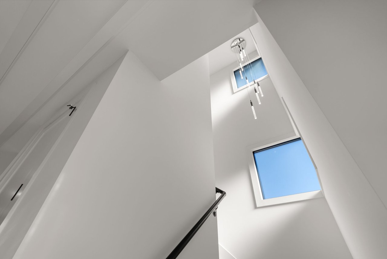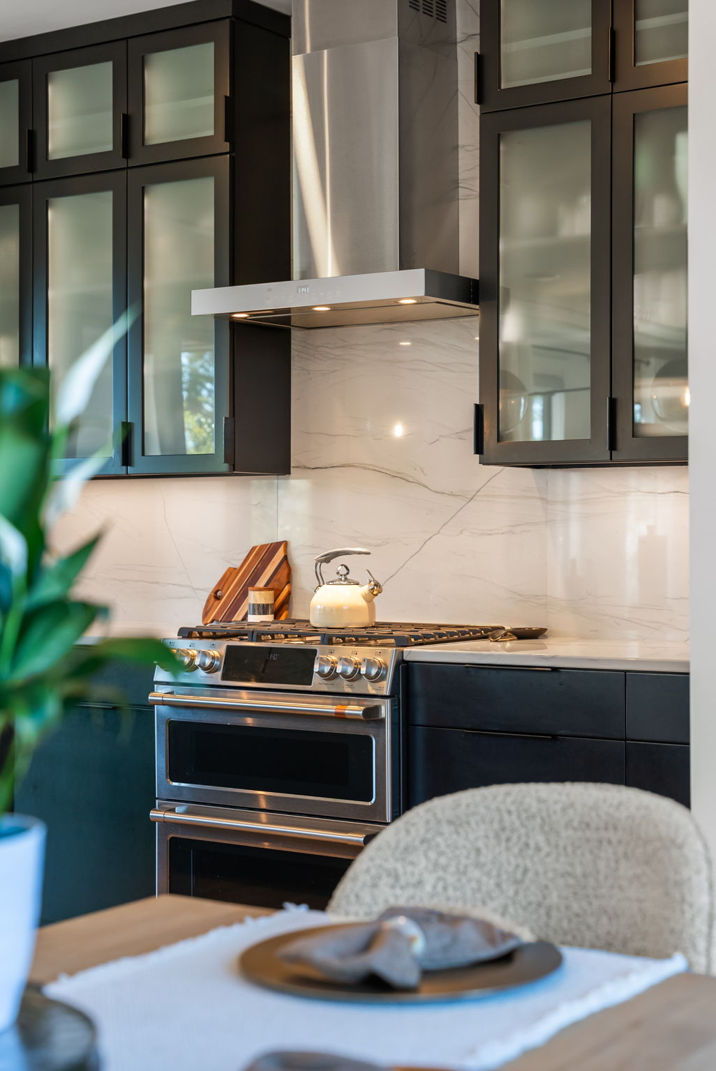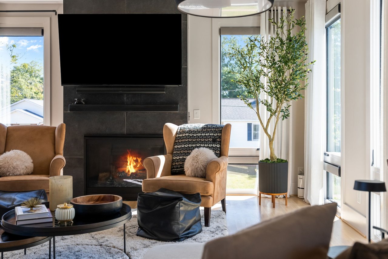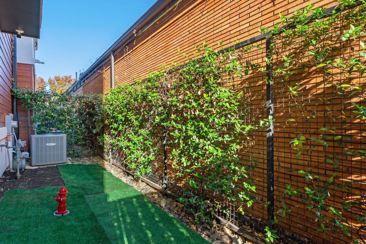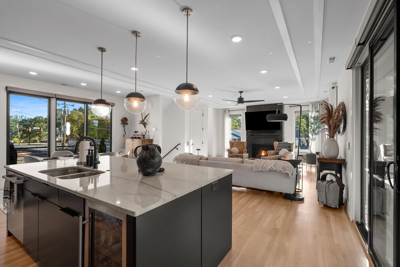 Through floor-to-ceiling casement windows and sliding doors, natural light welcomes you on each level. The ground floor showcases stained concrete floors, a flex room for a study or guest bedroom, a full bathroom with a walk-in tile shower, and access to the epoxy-coated garage and the fenced-in, turfed backyard. Head to level two via the hardwood-enveloped elevator or the brightly lit stairwell. Take in the second-story finishes throughout the living area, kitchen, half bath, and dining room—featuring white oak hardwoods, a gas fireplace with a large-format slate tile surround, sleek coffered ceiling moldings, custom window treatments, a chic ceiling fan and pendants, and recessed LED lighting. The kitchen's quartz covers the massive island, countertops, and range wall to the ceiling. The stained, slab-style cabinetry extends floor to ceiling, featuring opaque glass and custom lighting that accentuates the ceiling height. Conveniently access the two spacious covered terraces with slate-style flooring through the kitchen or dining area—ideal for indoor-outdoor entertaining or unwinding.