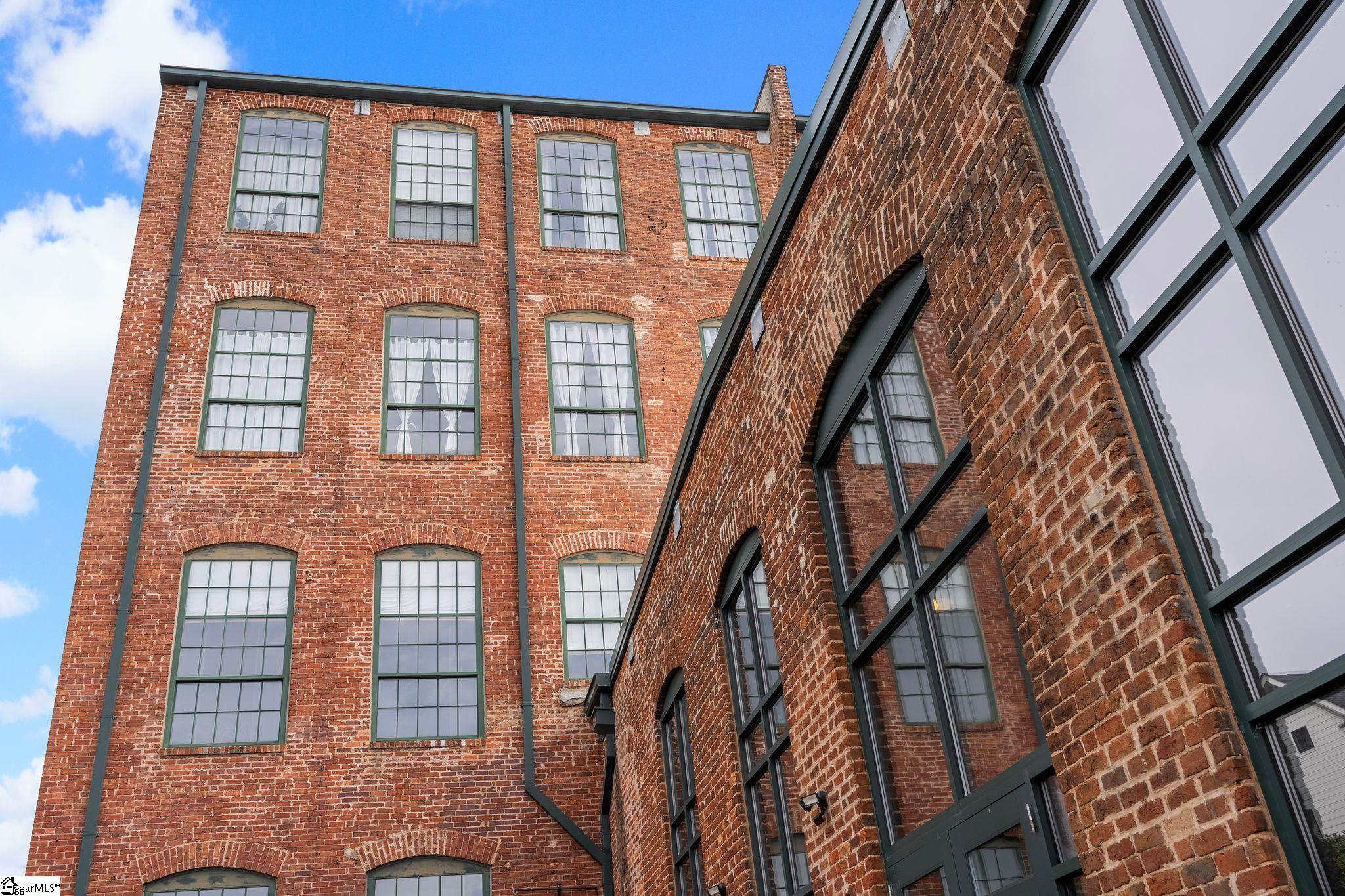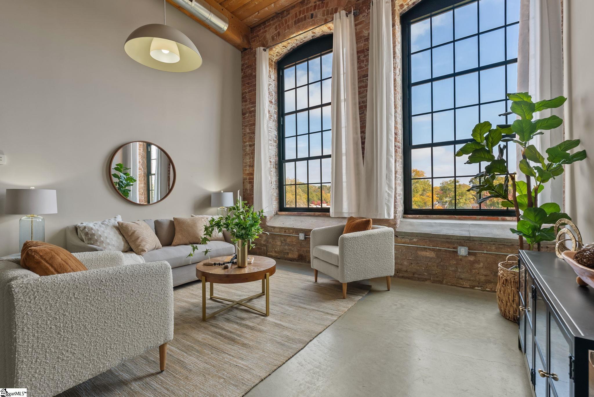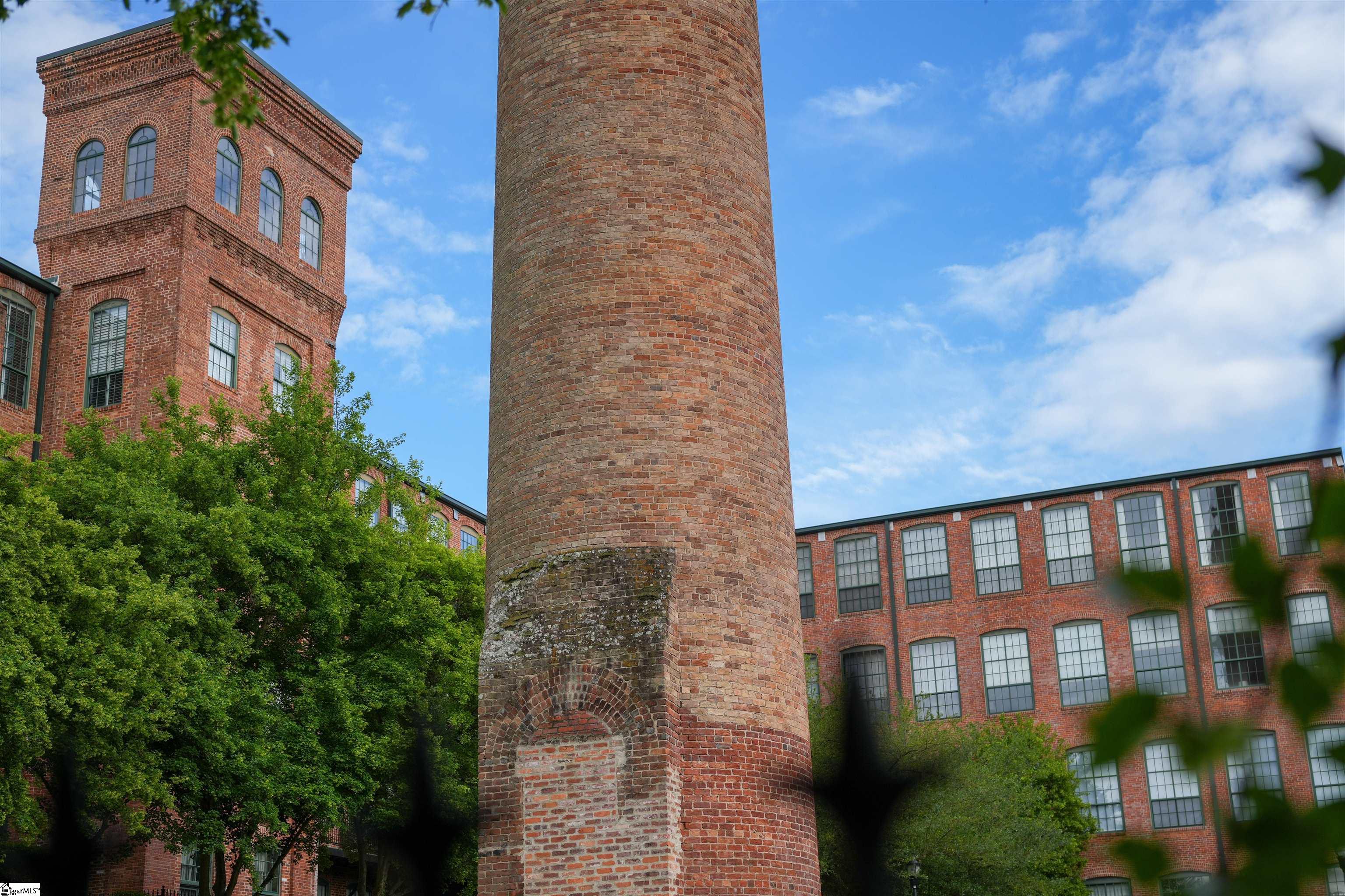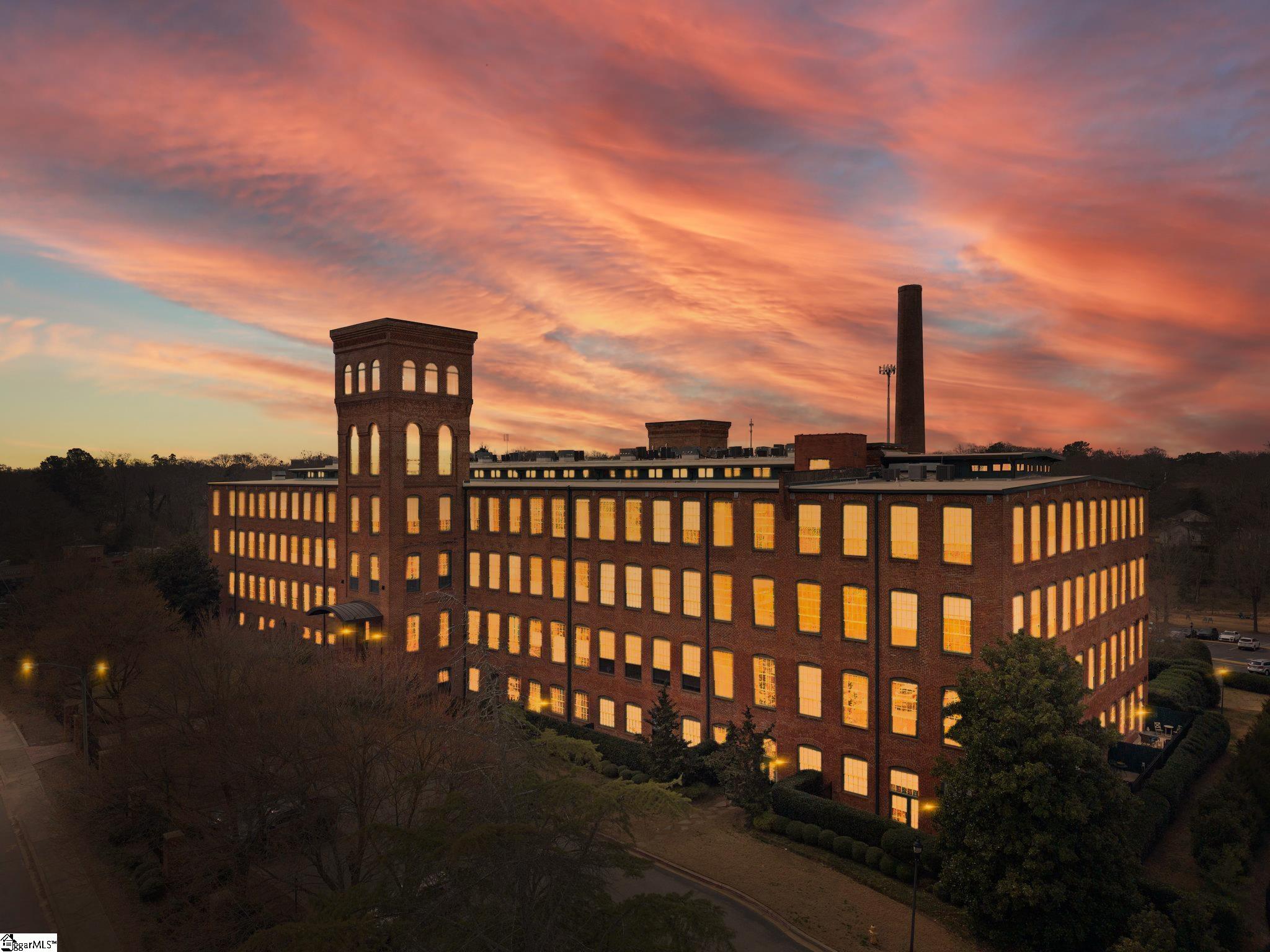 Experience breathtaking top-floor views from this elegant downtown residence within Greenville's historic Lofts at Mills Mill, a distinctive and nationally registered historic landmark originally built in the 1920's as a textile mill and masterfully renovated in 2004, meticulously preserving its unique architectural character. The community's common areas immediately set a tone of sophisticated urban ambiance, featuring preserved exposed brick, warm heart of pine ceilings, and polished concrete floors. This condominium is a superb two-bedroom, two-full-bathroom layout, defined by a stunning two-story entertaining space on the main level with soaring ceilings, expansive windows that fill the area with light, and the building's signature brick details. The residence presents a pristine condition, featuring brand new carpeting and freshly painted walls throughout. Seamlessly blending industrial roots with modern functionality, the kitchen is tastefully updated with sleek granite countertops, stainless steel appliances, and a gas stove. The primary suite is a private lofted retreat, while both full bathrooms boast fully tiled showers, and the primary bath includes a relaxing soaking tub. This residence combines exceptional style with convenience, offering generous storage and a new stackable washer and dryer included, and the ownership experience is further enhanced by a comprehensive HOA that covers water, natural gas, pest control, trash removal, and building maintenance. Community amenities enrich the lifestyle with a swimming pool, fitness center, large dog park, secure gated parking, outdoor grilling areas, a community fire pit, and beautiful gardens, all strategically located just off Augusta Road and near major hospitals, offering exceptional urban living in a revered historic setting.