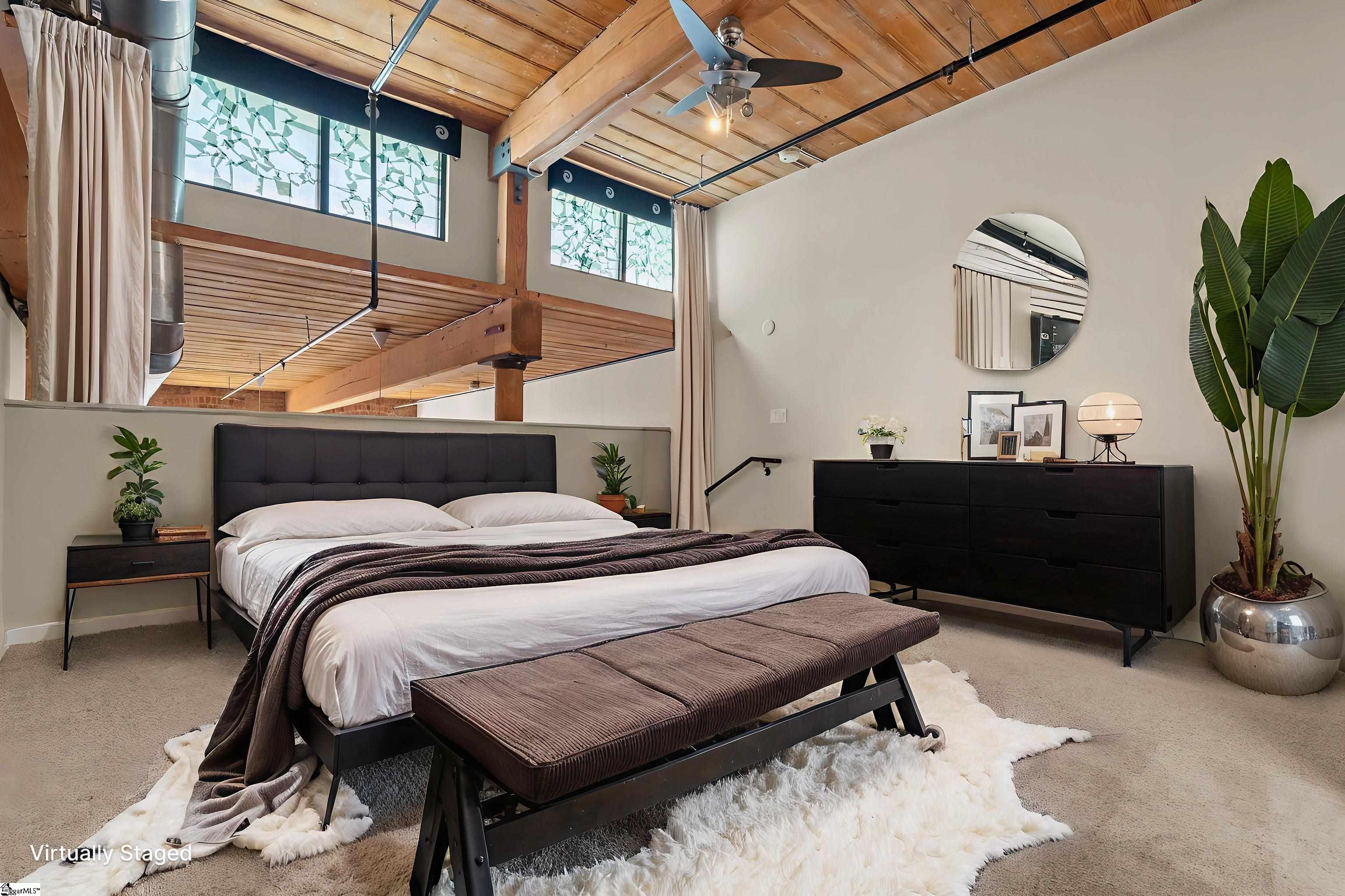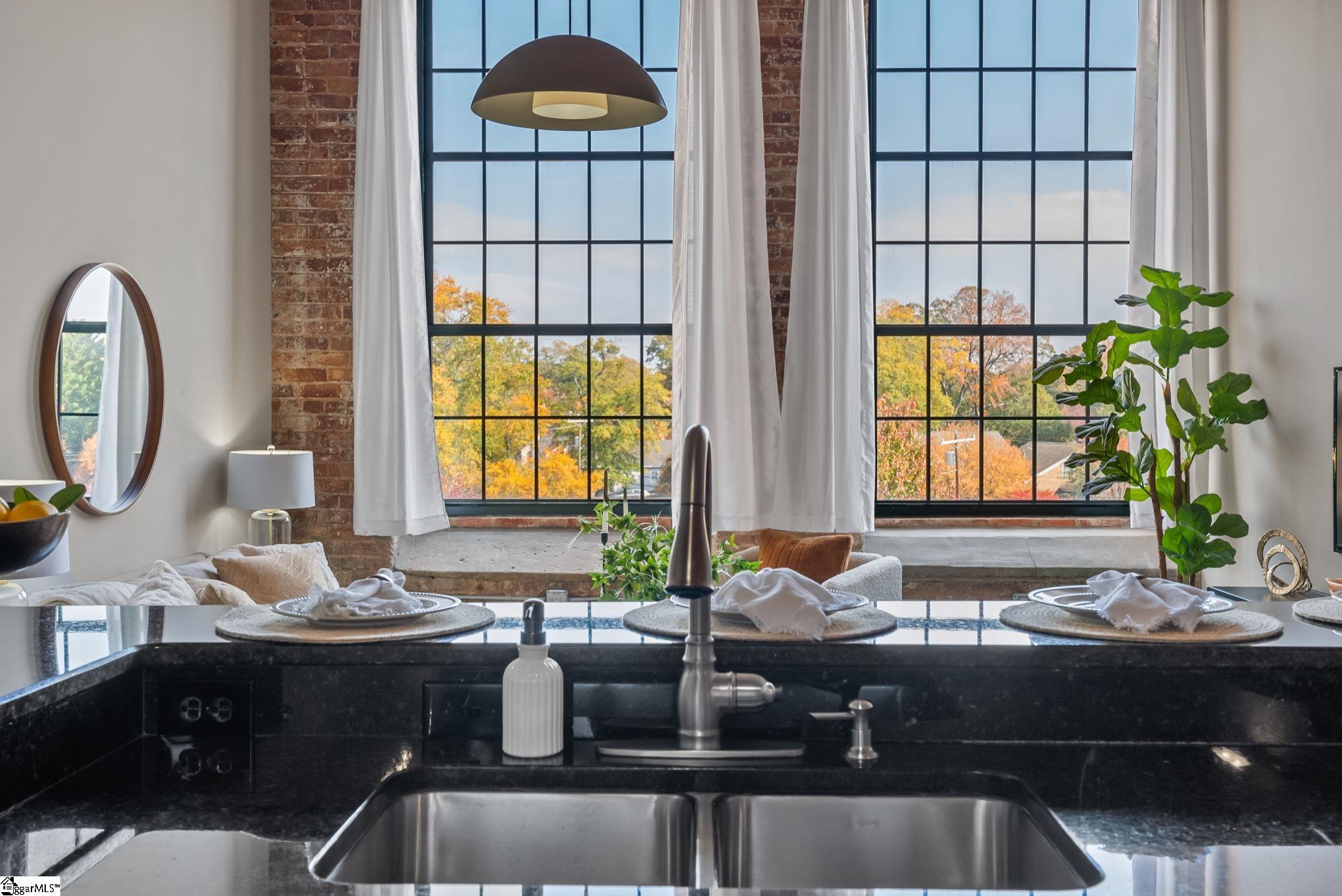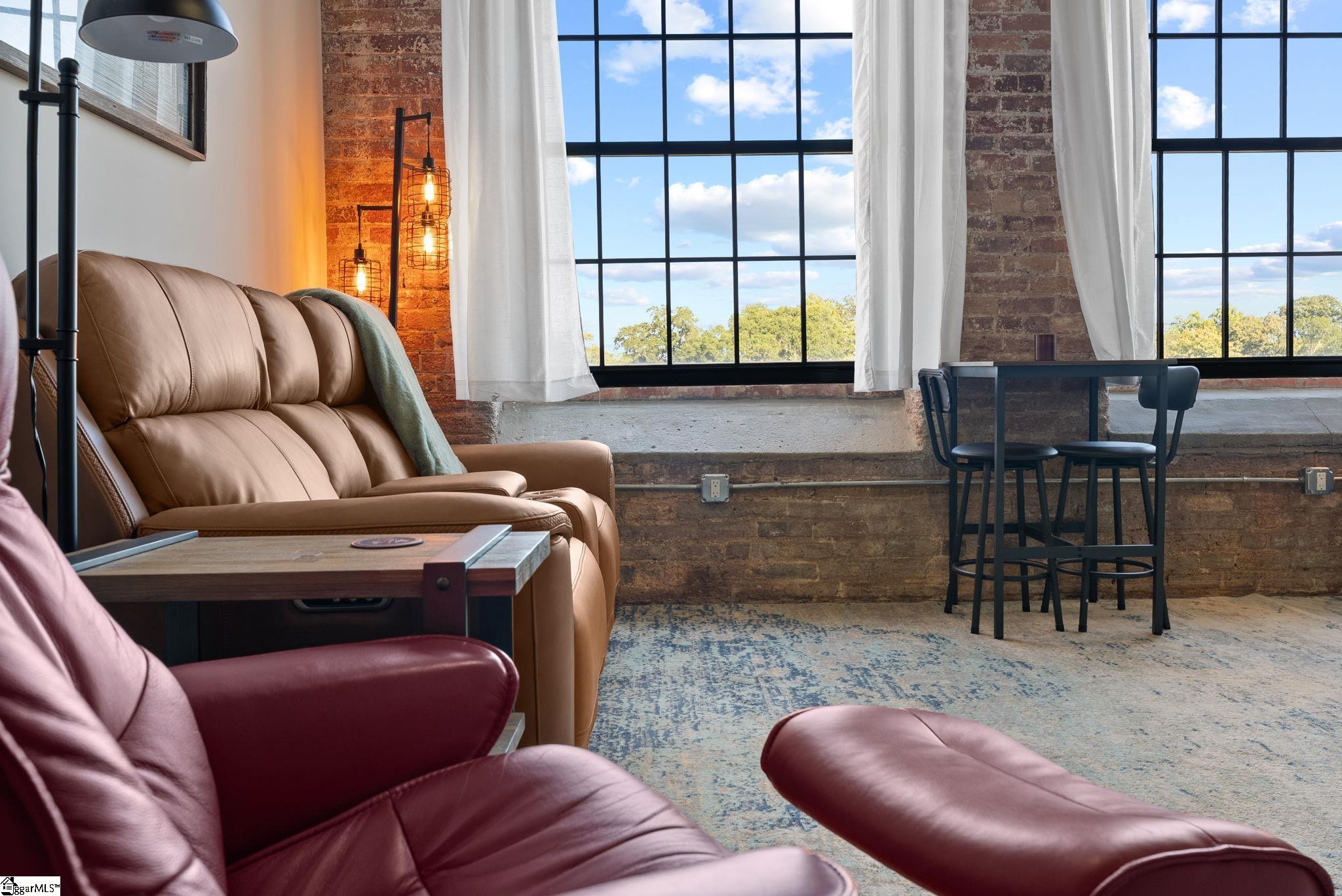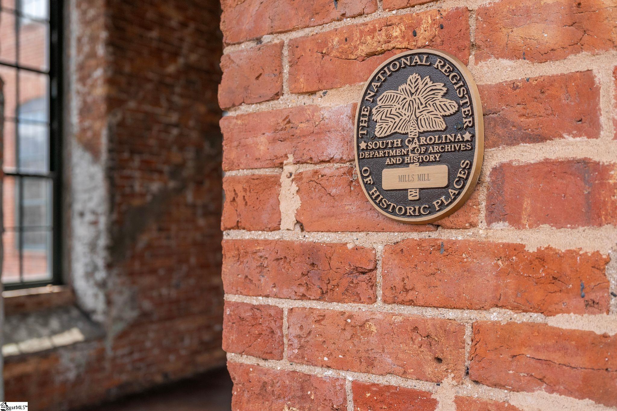 Experience breathtaking top-floor views from this elegant downtown residence within Greenville's historic Lofts at Mills Mill, a distinctive and nationally registered historic landmark originally built in the 1920's as a textile mill and masterfully renovated in 2004, meticulously preserving its unique architectural character. The community's common areas immediately set a tone of sophisticated urban ambiance, featuring preserved exposed brick, warm heart of pine ceilings, and polished concrete floors. This condominium is a superb two-bedroom, two-full-bathroom layout, defined by a stunning two-story entertaining space on the main level with soaring ceilings, expansive windows that fill the area with light, and the building's signature brick details. The residence presents a pristine condition, featuring brand new carpeting and freshly painted walls throughout. Seamlessly blending industrial roots with modern functionality, the kitchen is tastefully updated with sleek granite countertops, stainless steel appliances, and a gas stove. The primary suite is a private lofted retreat, while both full bathrooms boast fully tiled showers, and the primary bath includes a relaxing soaking tub. This residence combines exceptional style with convenience, offering generous storage and a new stackable washer and dryer included, and the ownership experience is further enhanced by a comprehensive HOA that covers water, natural gas, pest control, trash removal, and building maintenance. Community amenities enrich the lifestyle with a swimming pool, fitness center, large dog park, secure gated parking, outdoor grilling areas, a community fire pit, and beautiful gardens, all strategically located just off Augusta Road and near major hospitals, offering exceptional urban living in a revered historic setting.