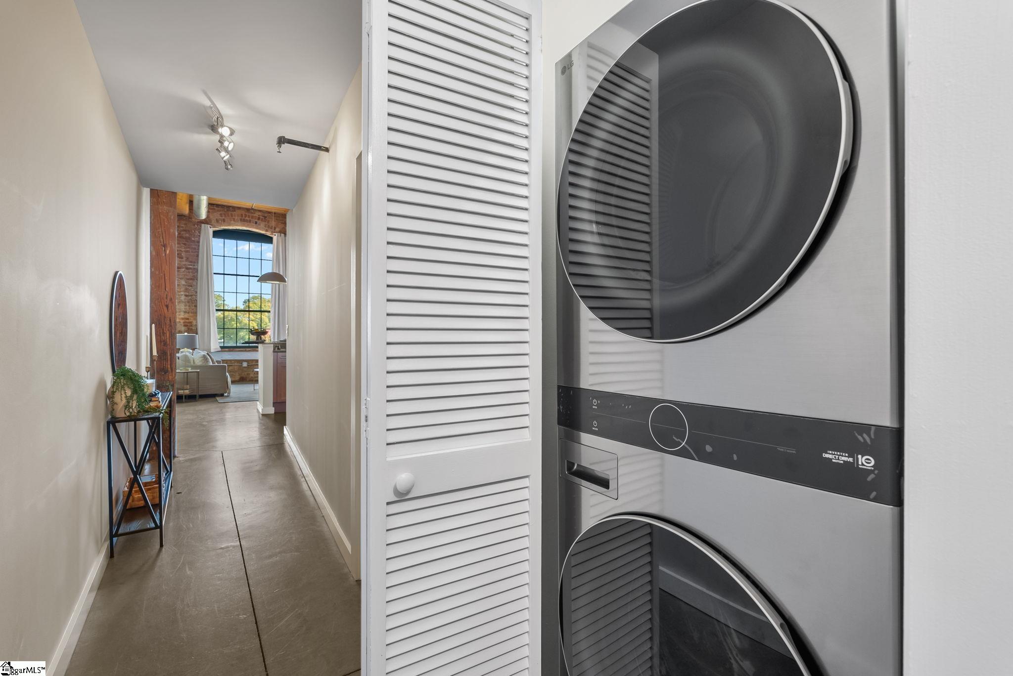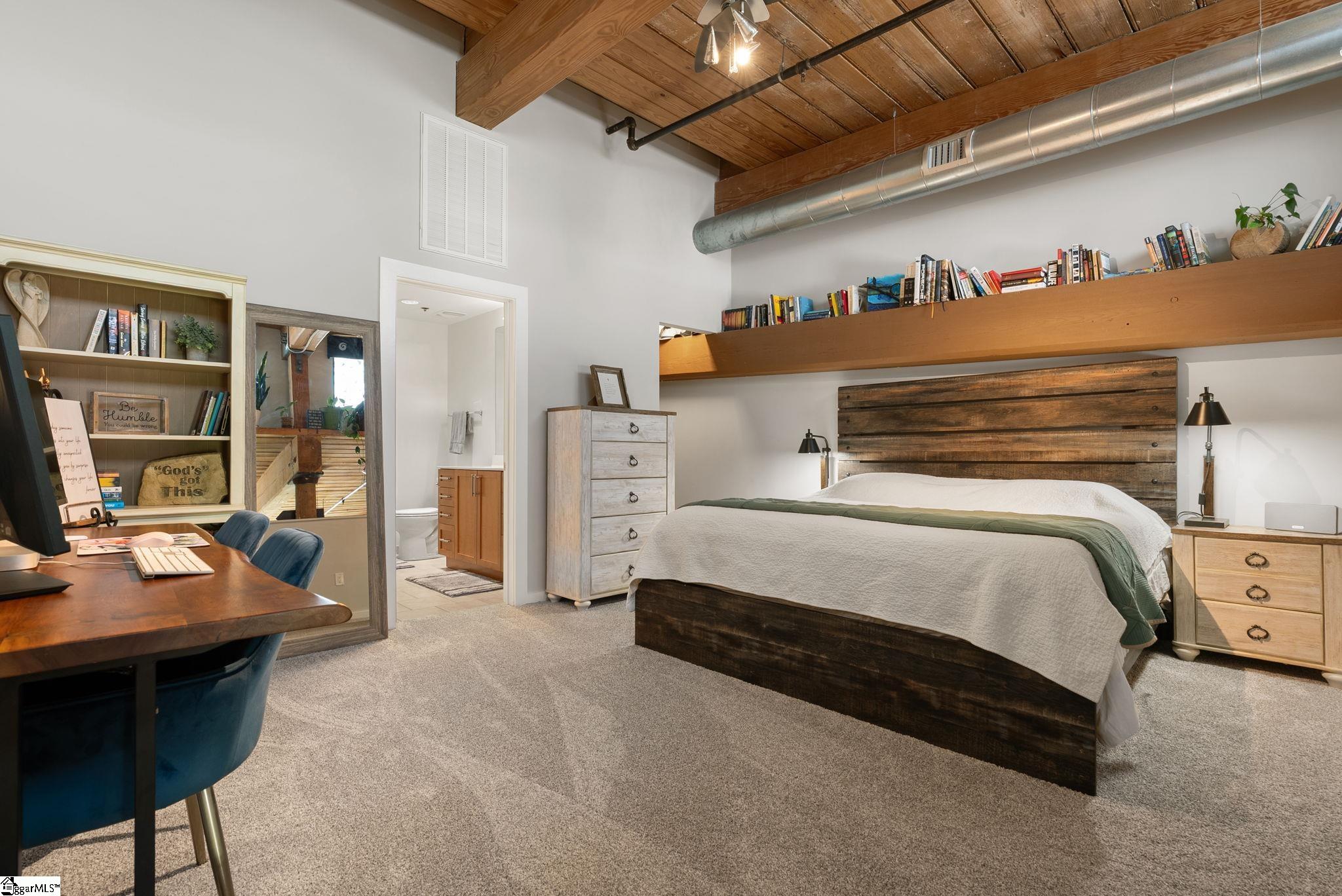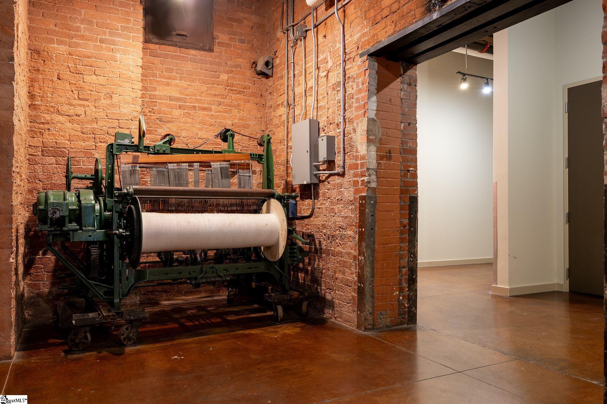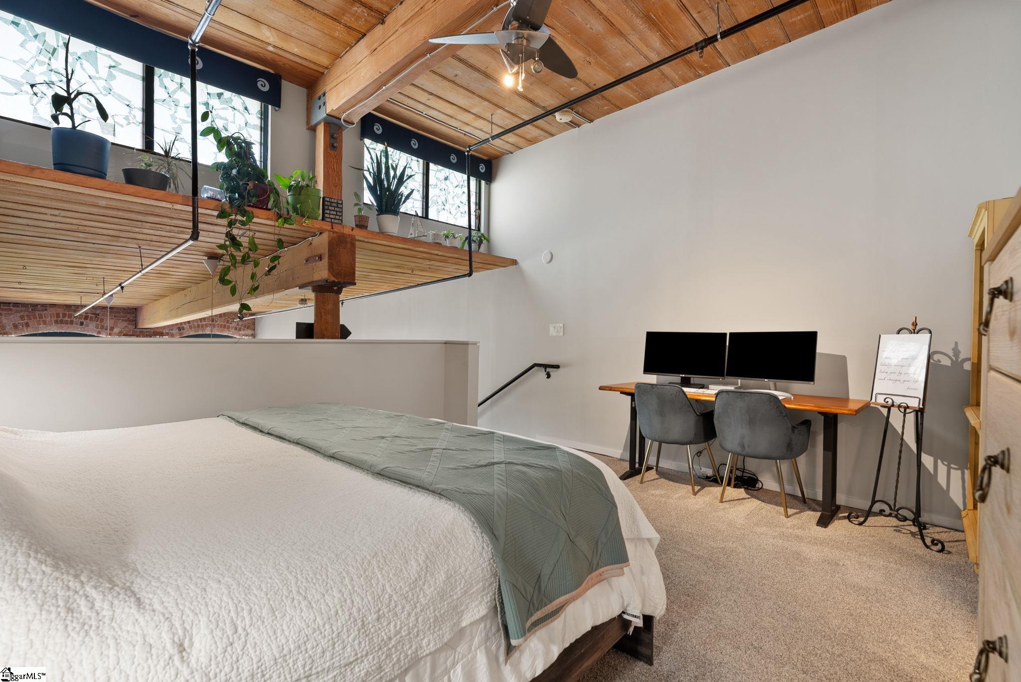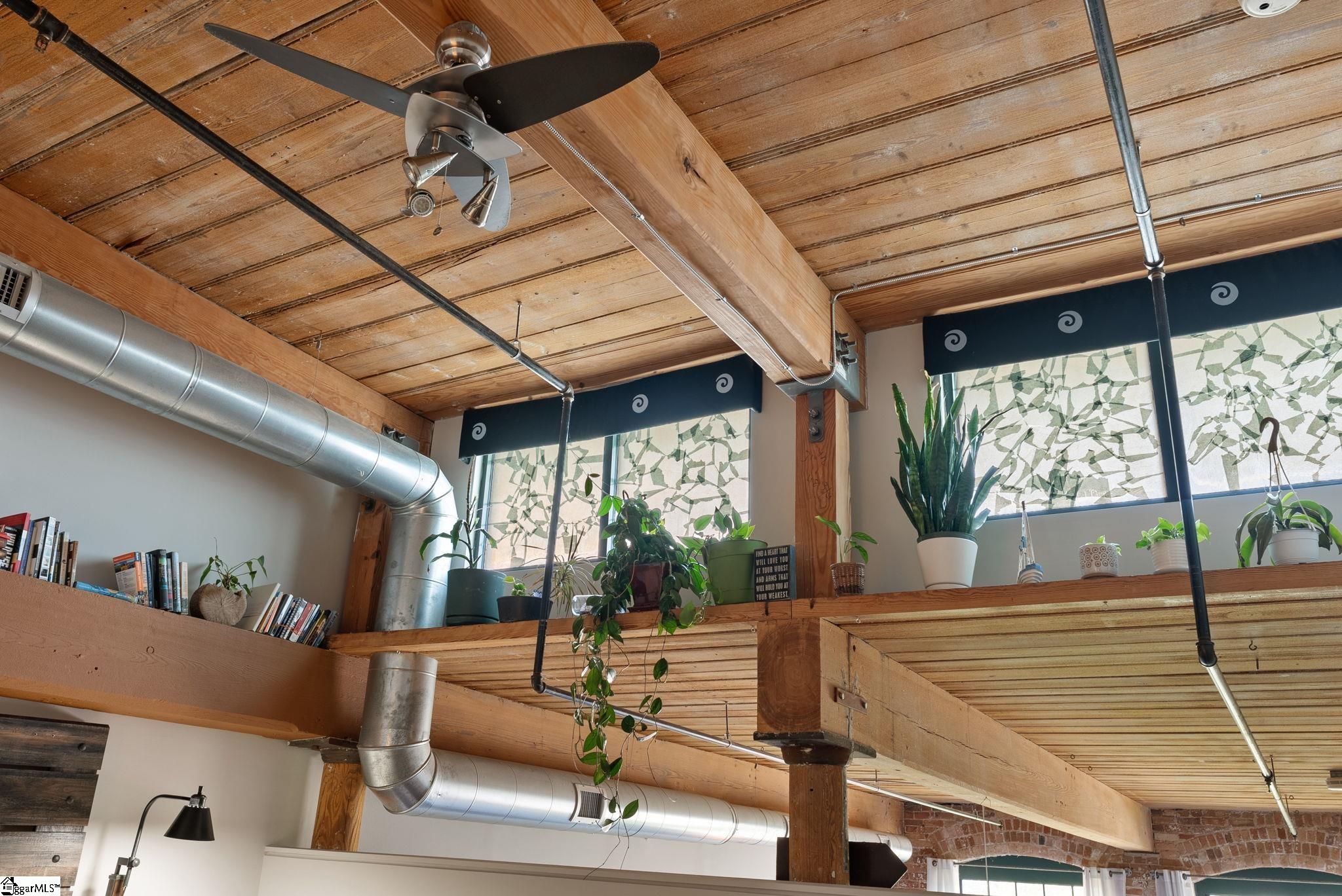 Experience breathtaking top-floor views from this elegant downtown residence within Greenville's historic Lofts at Mills Mill, a distinctive and nationally registered historic landmark originally built in the 1920's as a textile mill and masterfully renovated in 2004, meticulously preserving its unique architectural character. The community's common areas immediately set a tone of sophisticated urban ambiance, featuring preserved exposed brick, warm heart of pine ceilings, and polished concrete floors. This condominium is a superb two-bedroom, two-full-bathroom layout, defined by a stunning two-story entertaining space on the main level with soaring ceilings, expansive windows that fill the area with light, and the building's signature brick details. The residence presents a pristine condition, featuring brand new carpeting and freshly painted walls throughout. Seamlessly blending industrial roots with modern functionality, the kitchen is tastefully updated with sleek granite countertops, stainless steel appliances, and a gas stove. The primary suite is a private lofted retreat, while both full bathrooms boast fully tiled showers, and the primary bath includes a relaxing soaking tub. This residence combines exceptional style with convenience, offering generous storage and a new stackable washer and dryer included, and the ownership experience is further enhanced by a comprehensive HOA that covers water, natural gas, pest control, trash removal, and building maintenance. Community amenities enrich the lifestyle with a swimming pool, fitness center, large dog park, secure gated parking, outdoor grilling areas, a community fire pit, and beautiful gardens, all strategically located just off Augusta Road and near major hospitals, offering exceptional urban living in a revered historic setting.