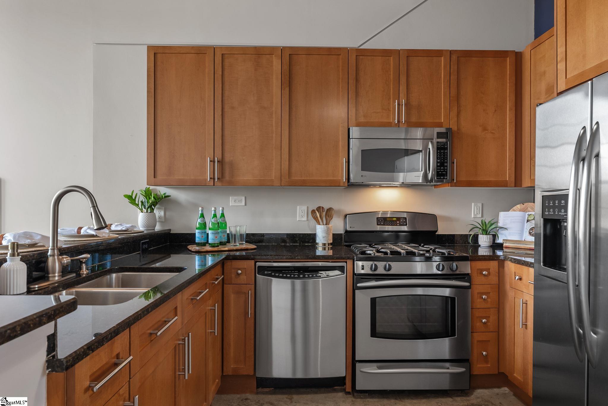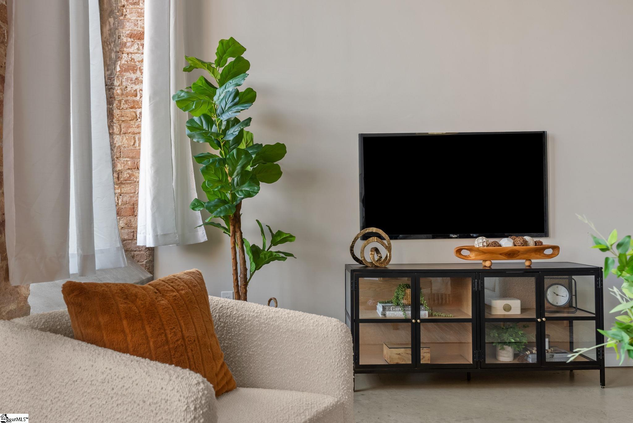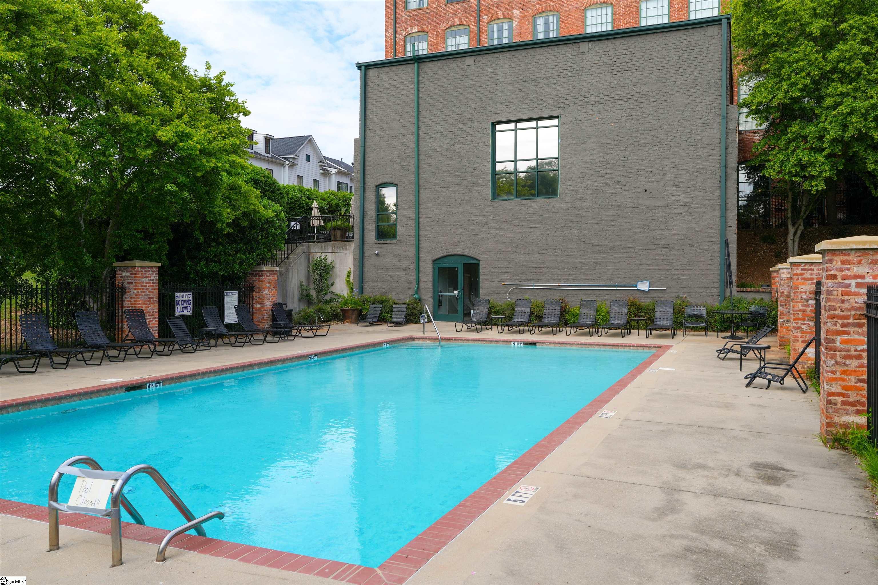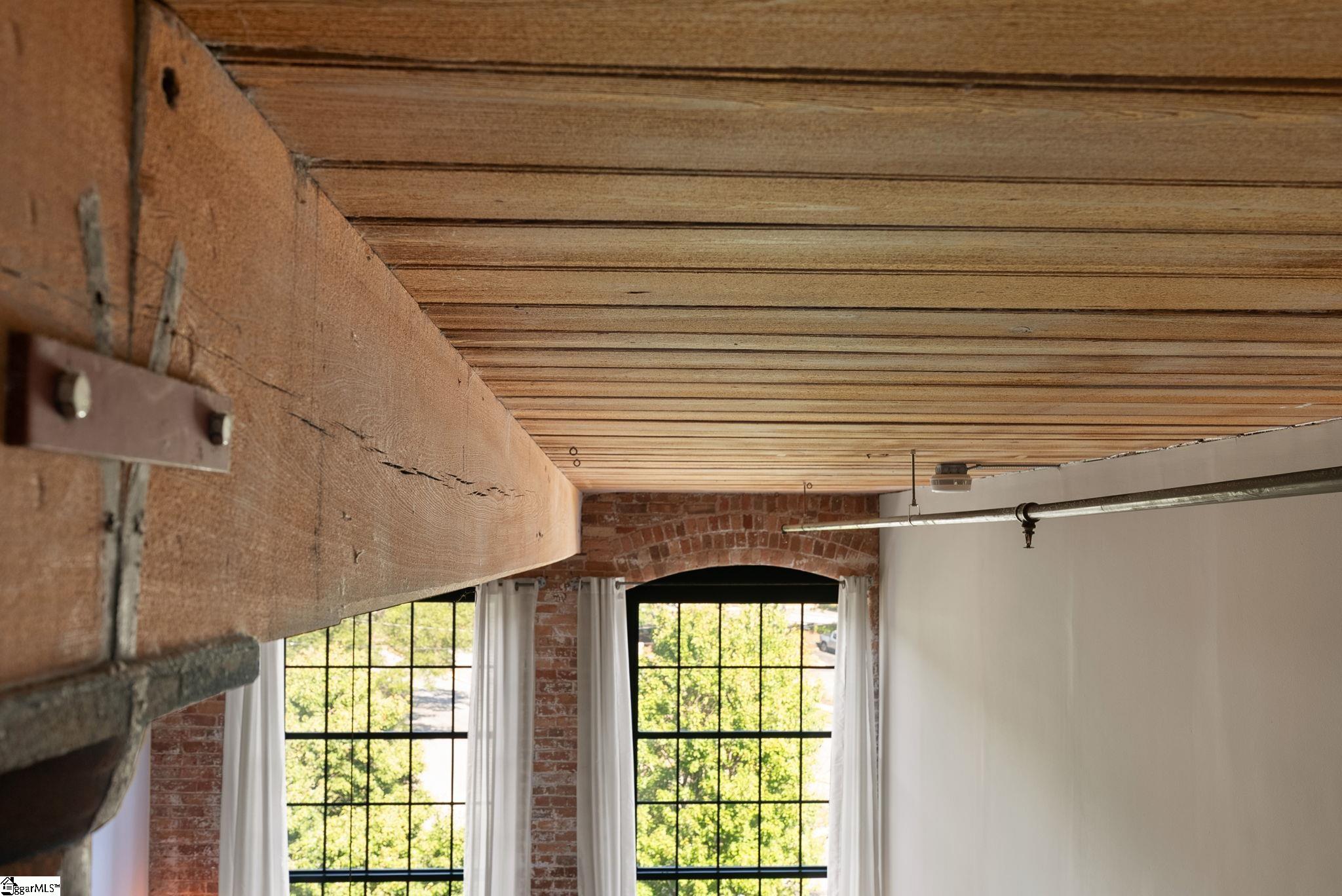Experience breathtaking top-floor views from this elegant downtown residence within Greenville's historic Lofts at Mills Mill, a distinctive and nationally registered historic landmark originally built in the 1920's as a textile mill and masterfully renovated in 2004, meticulously preserving its unique architectural character. The community's common areas immediately set a tone of sophisticated urban ambiance, featuring preserved exposed brick, warm heart of pine ceilings, and polished concrete floors. This condominium is a superb two-bedroom, two-full-bathroom layout, defined by a stunning two-story entertaining space on the main level with soaring ceilings, expansive windows that fill the area with light, and the building's signature brick details. The residence presents a pristine condition, featuring brand new carpeting and freshly painted walls throughout. Seamlessly blending industrial roots with modern functionality, the kitchen is tastefully updated with sleek granite countertops, stainless steel appliances, and a gas stove. The primary suite is a private lofted retreat, while both full bathrooms boast fully tiled showers, and the primary bath includes a relaxing soaking tub. This residence combines exceptional style with convenience, offering generous storage and a new stackable washer and dryer included, and the ownership experience is further enhanced by a comprehensive HOA that covers water, natural gas, pest control, trash removal, and building maintenance. Community amenities enrich the lifestyle with a swimming pool, fitness center, large dog park, secure gated parking, outdoor grilling areas, a community fire pit, and beautiful gardens, all strategically located just off Augusta Road and near major hospitals, offering exceptional urban living in a revered historic setting.