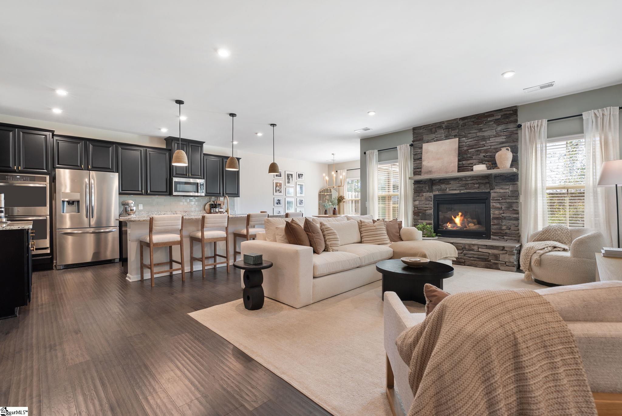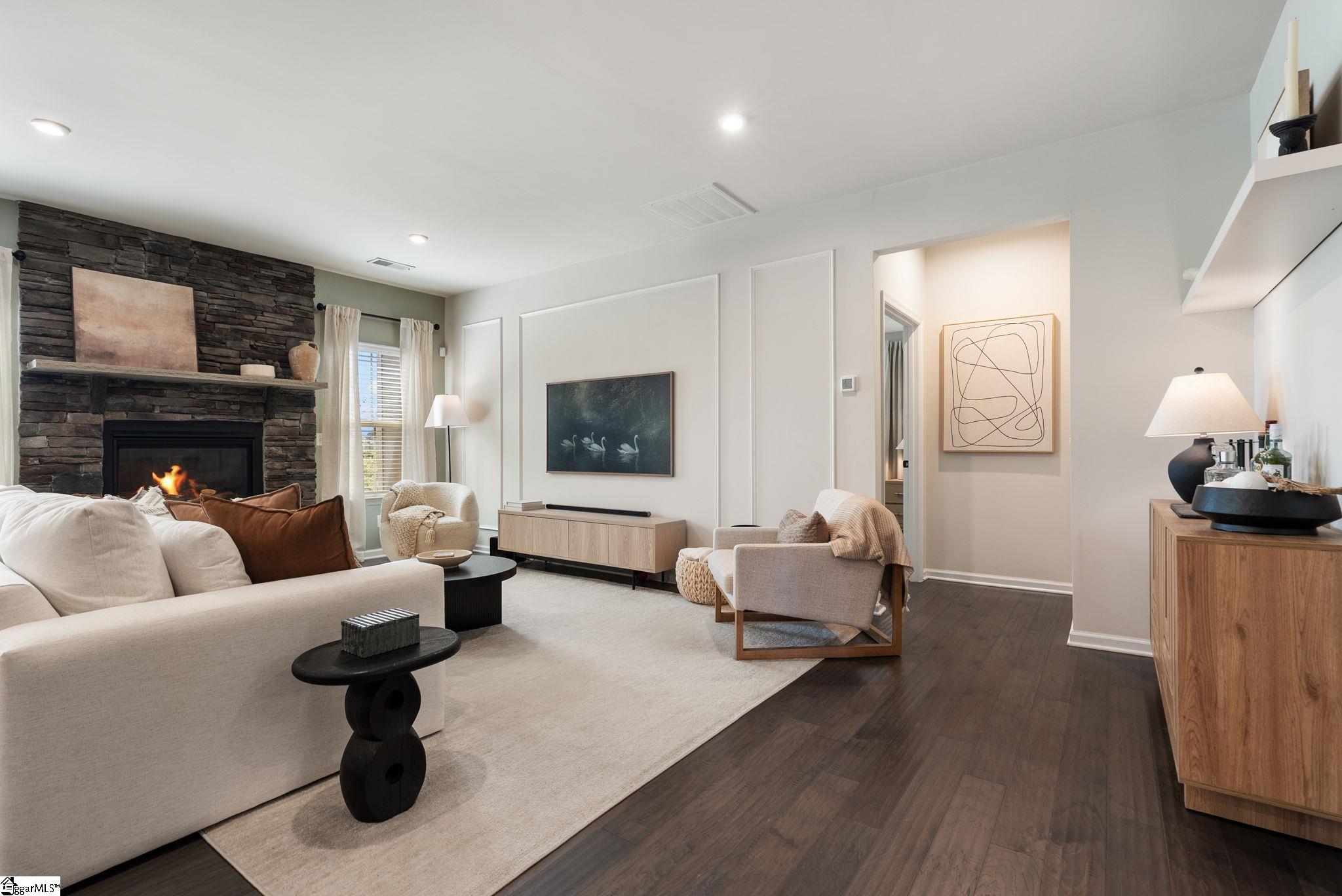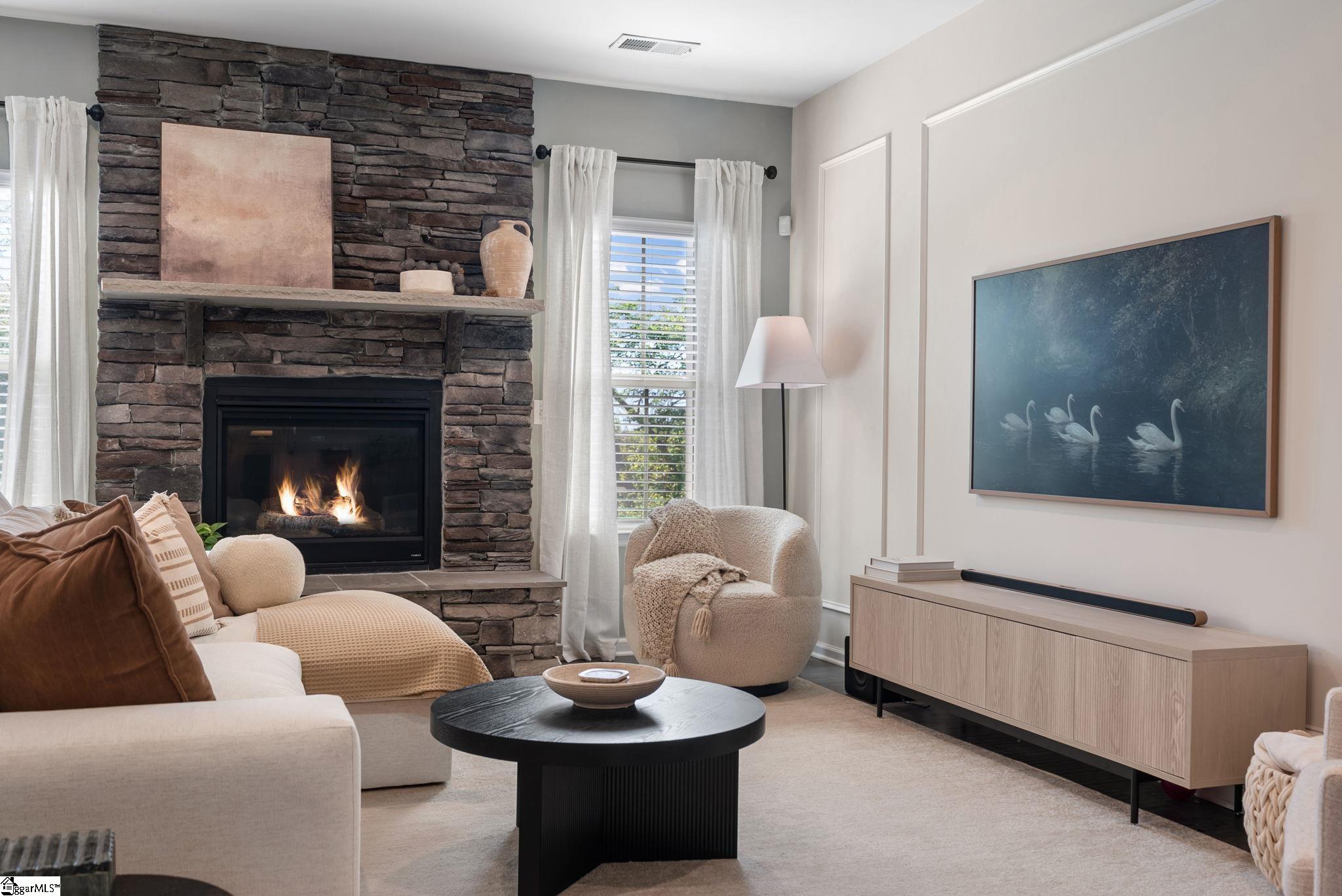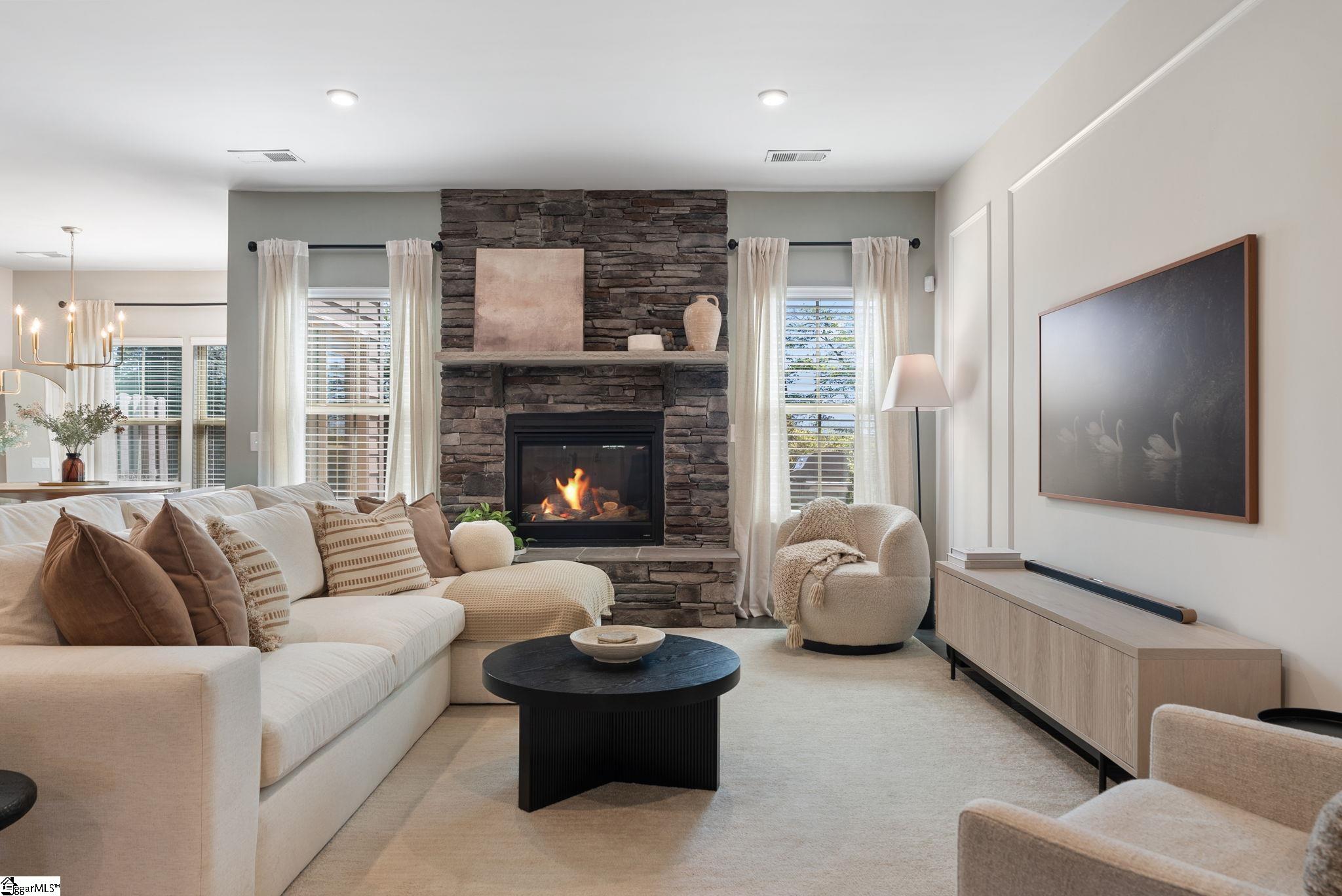 Nestled in the prestigious Five Forks enclave, 82 Hemingway Lane is a masterpiece of craftsman sophistication that seamlessly harmonizes architectural elegance with a low-maintenance lifestyle. The interior is defined by a sense of volume and light, characterized by expansive nine-foot ceilings and rich hardwood floors that guide you through an intuitive open-concept layout. At the heart of the home, a stately living room anchored by a classic gas fireplace flows effortlessly into a gourmet culinary suite, where premium granite countertops, a substantial social island, and professional-grade double wall ovens cater to the modern epicurean. This thoughtful design extends to a dedicated wine cellar closet and a sun-drenched breakfast nook, ideal for both grand entertaining and quiet mornings. The main-level primary retreat serves as a private sanctuary, featuring a spa-inspired en-suite with a deep garden soaking tub and a voluminous walk-in closet. Upstairs, the home offers immense versatility with three generous bedrooms and a sprawling den, complemented by an unfinished attic that provides discreet, ample storage. The exterior artistry is equally refined, featuring a private patio and a professionally landscaped lot maintained by a full-yard irrigation system. With an HOA that oversees all lawn care, this residence offers a turnkey lifestyle of "luxury without the labor," all while being situated moments from the premier dining of Five Forks and the vibrant energy of Simpsonville's historic Main Street.