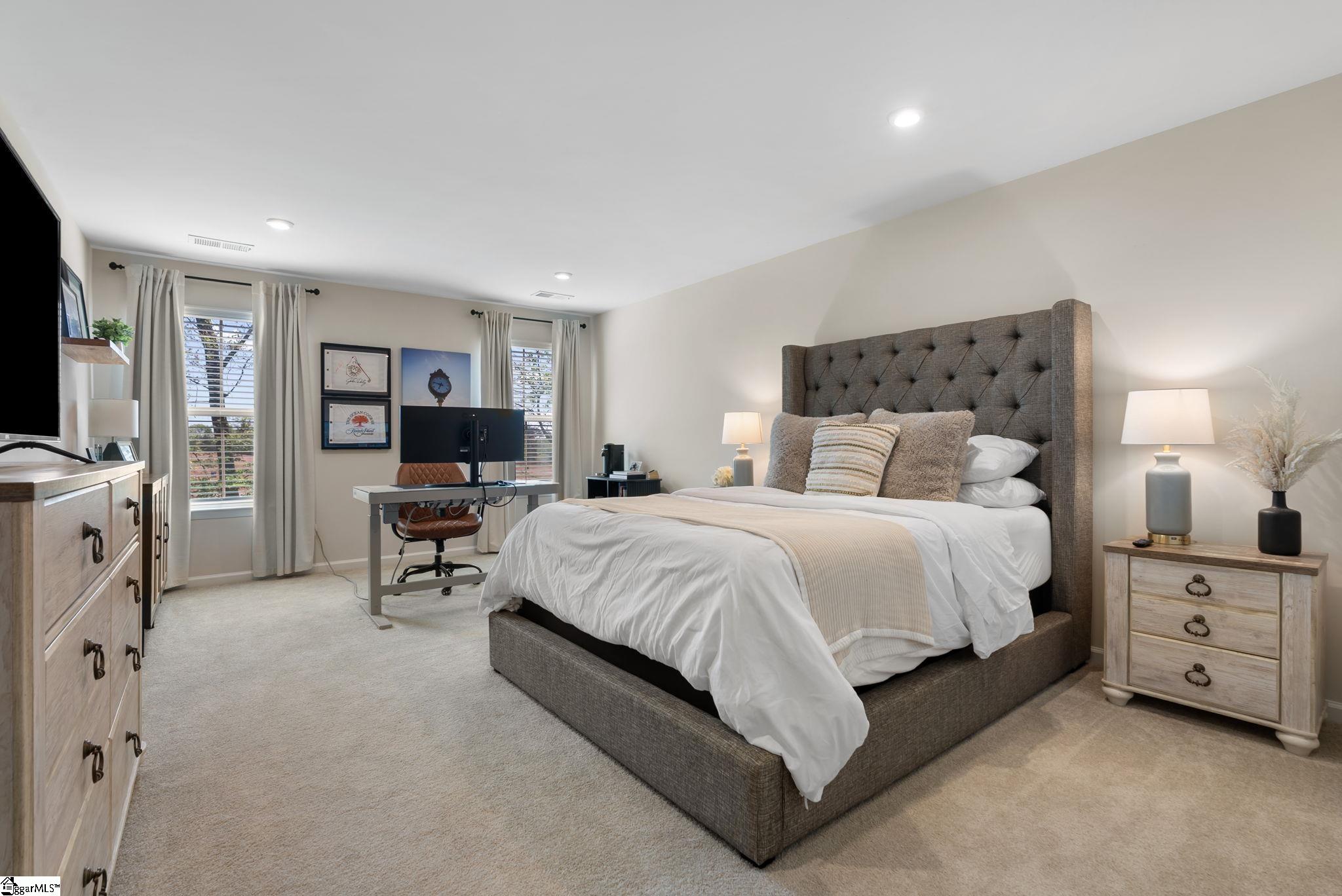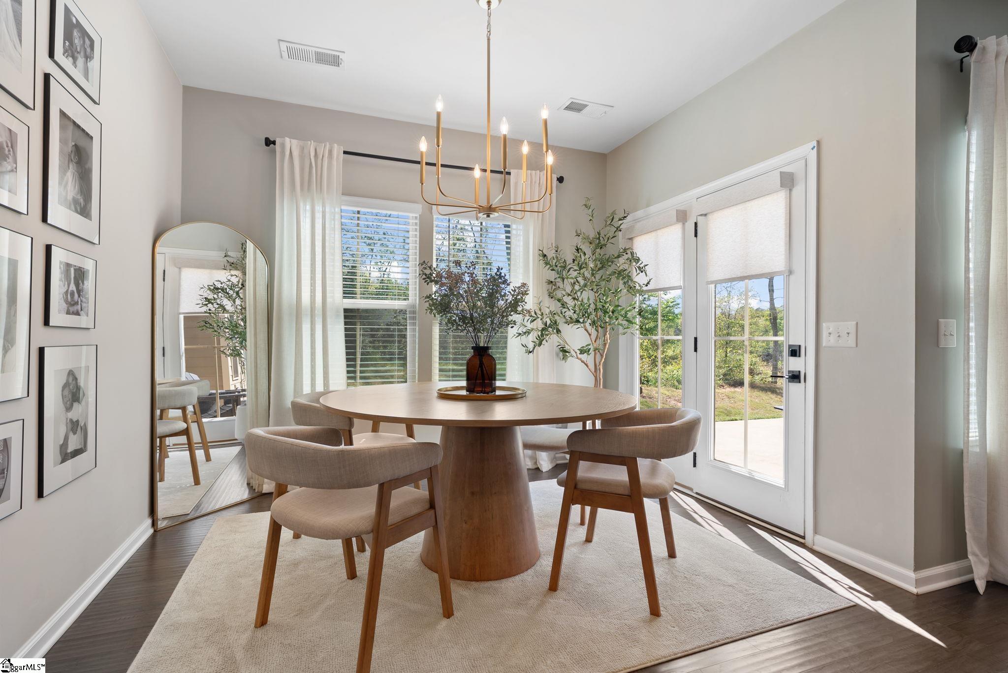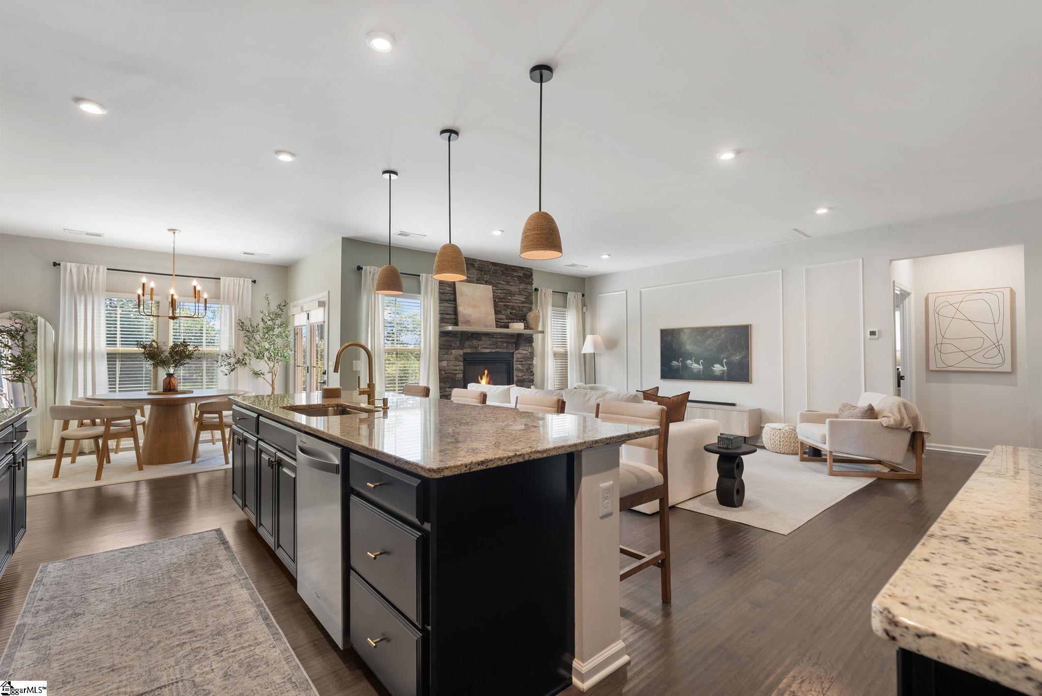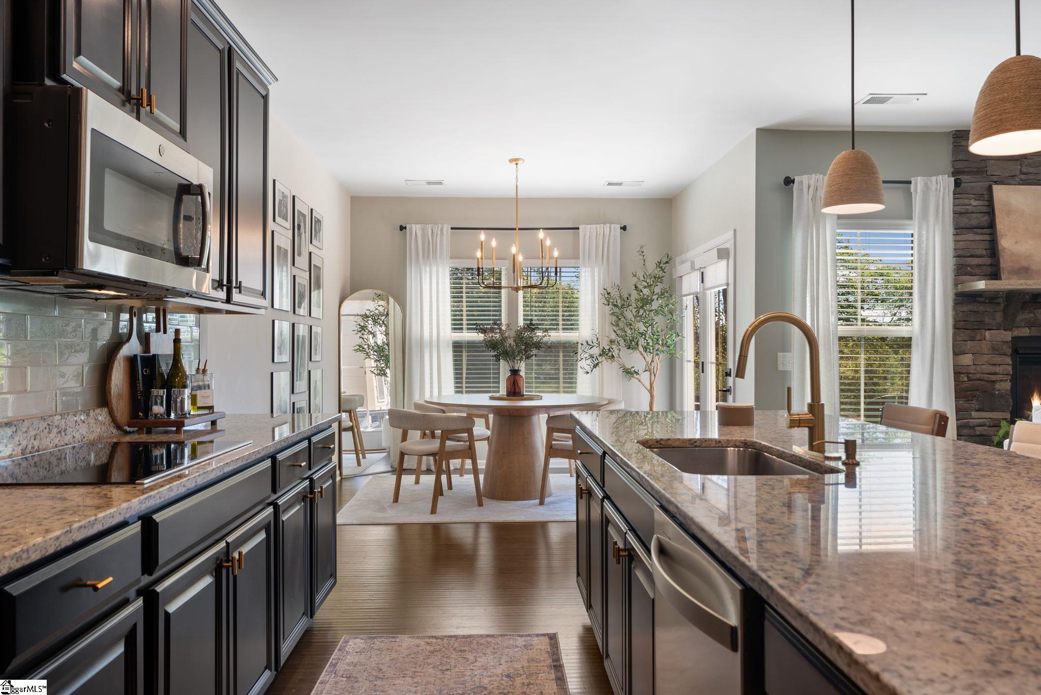 Nestled in the prestigious Five Forks enclave, 82 Hemingway Lane is a masterpiece of craftsman sophistication that seamlessly harmonizes architectural elegance with a low-maintenance lifestyle. The interior is defined by a sense of volume and light, characterized by expansive nine-foot ceilings and rich hardwood floors that guide you through an intuitive open-concept layout. At the heart of the home, a stately living room anchored by a classic gas fireplace flows effortlessly into a gourmet culinary suite, where premium granite countertops, a substantial social island, and professional-grade double wall ovens cater to the modern epicurean. This thoughtful design extends to a dedicated wine cellar closet and a sun-drenched breakfast nook, ideal for both grand entertaining and quiet mornings. The main-level primary retreat serves as a private sanctuary, featuring a spa-inspired en-suite with a deep garden soaking tub and a voluminous walk-in closet. Upstairs, the home offers immense versatility with three generous bedrooms and a sprawling den, complemented by an unfinished attic that provides discreet, ample storage. The exterior artistry is equally refined, featuring a private patio and a professionally landscaped lot maintained by a full-yard irrigation system. With an HOA that oversees all lawn care, this residence offers a turnkey lifestyle of "luxury without the labor," all while being situated moments from the premier dining of Five Forks and the vibrant energy of Simpsonville's historic Main Street.